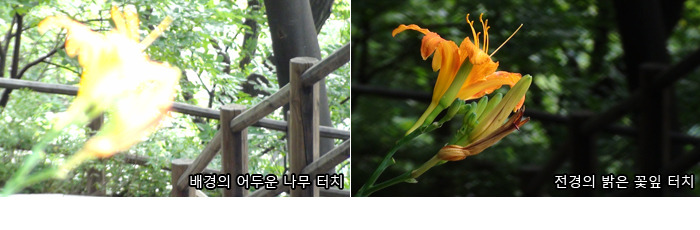 배경의 검은 나무를 터치하면 나무의 표면을 알아볼 수 있을 정도로 노출이 밝아지고, 나무에 정확히 초점이 맞는 것을 볼 수 있습니다. 반대로 전경의 꽃 중에서 가장 밝은 하일라이트 부분을 터치하자, 초점이 꽃으로 이동하면서 동시에 노출이 조절되어 어둡고 진한 색감의 이미지를 얻을 수 있네요.