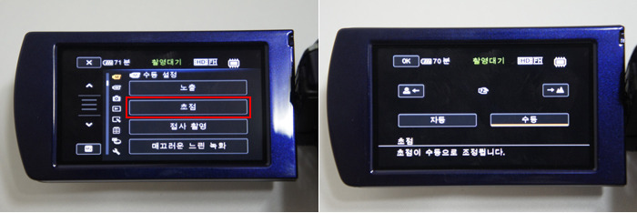 1. 핸디캠 메뉴의 '초점'을 선택합니다. 2. 하단의 '수동'을 클릭 후, 좌우의 버튼을 이용해 초점을 조절합니다.