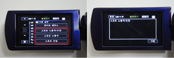 1. 핸디캠 메뉴의 '스포트 노출계/초점', '스포트 노출계', '스포트 초점' 중 원하는 것을 선택합니다. 2. 화면에 나타나는 박스 내부를 터치하면, 그 지점에 맞춰 노출계와 초점이 자동으로 설정됩니다.