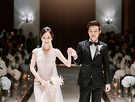 행진은 입장과 비슷한 방식으로 동체추적을 적극 활용하여 촬영합니다. 초반에는 망원계열 렌즈로 담는 편인데 얕은 심도를 위해 조리개를 개방하고 심도의 법칙에 따라 버진로드 중앙부분에서 신랑쪽에 포커스를 맞춥니다. 이때 플라워 샤워를 하는 경우가 많은 편인데 표준 줌 렌즈를 이용해 와이드한 느낌과 클로즈업 느낌 두가지를 모두 담아둡니다.