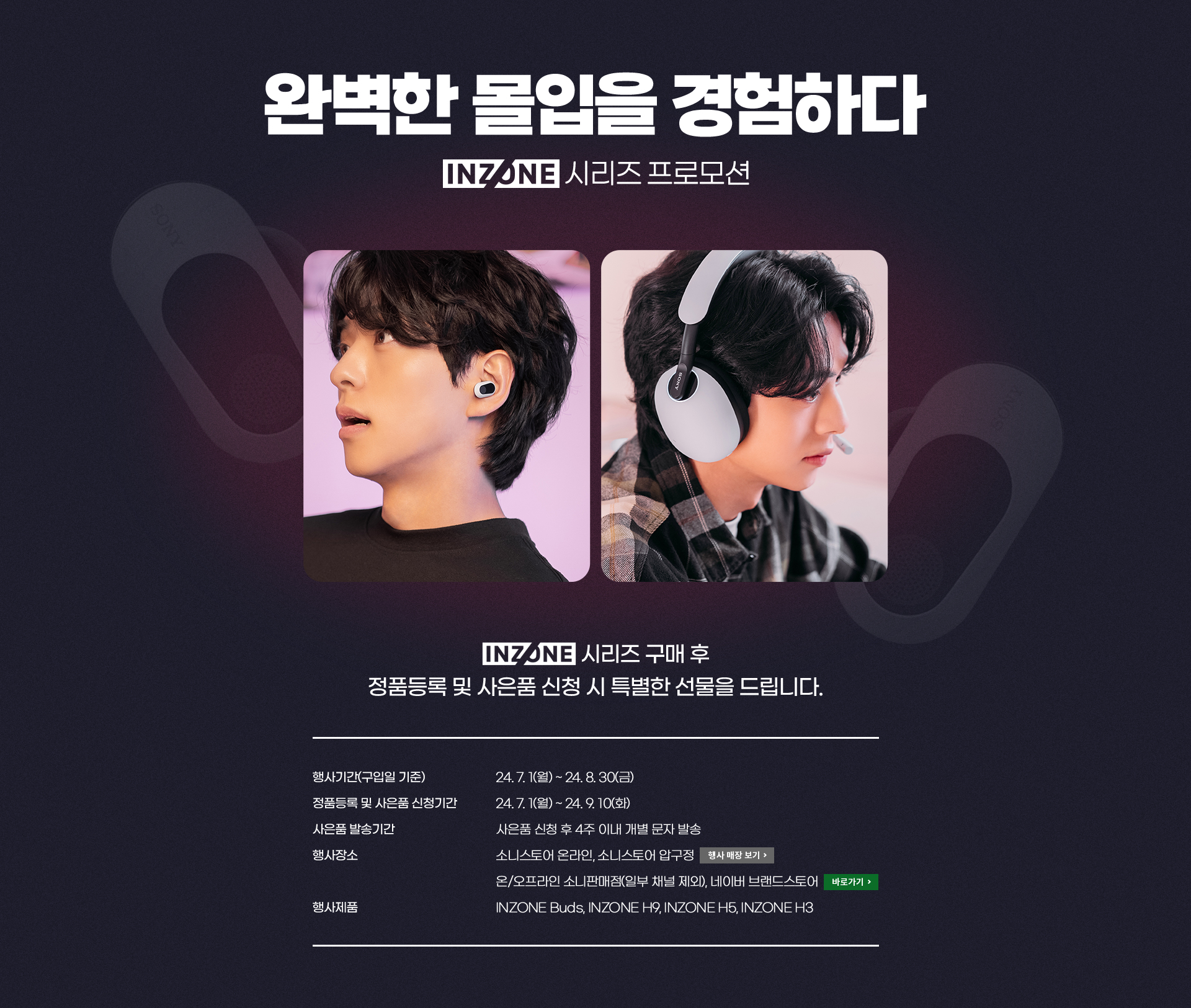 이벤트 기간 중 INZONE 시리즈 제품을 구입하고 9월 10일(화)까지 소니코리아 고객지원 사이트에서 정품 등록 후 사은품 신청까지 완료하면 모바일문화상품권을 증정한다. INZONE Buds 및 INZONE H9 구매 시 모바일문화상품권 2만원, INZONE H5 및 INZONE H3 구매 시 모바일문화상품권 1만원을 받을 수 있다. 모바일문화상품권은 INZONE 시리즈를 구매하는 주요 고객이 PC, PS5 유저인 점을 고려한 사은품으로, 플레이스테이션 네트워크(PSN)와 스팀(Steam) 등에서 활용 가능하다.