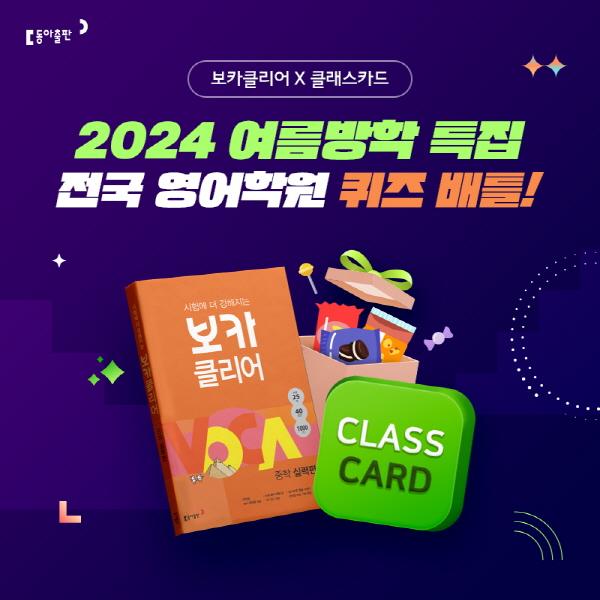 즐거운 여름 방학을 위한 이벤트도 기다리고 있습니다! 교육 콘텐츠 전문 기업 동아 출판㈜의 중고등 영어 어휘서 ‘보카클리어’가 에튜테크 스타트업 ㈜ 클래스카드와 협업을 진행하는데요. 영단어 실력을 겨뤄볼 수 있는 퀴즈 배틀이 8월 20일까지 전국의 모든 영어 학원, 초등학생 및 중학생을 대상으로 진행된다고 합니다.