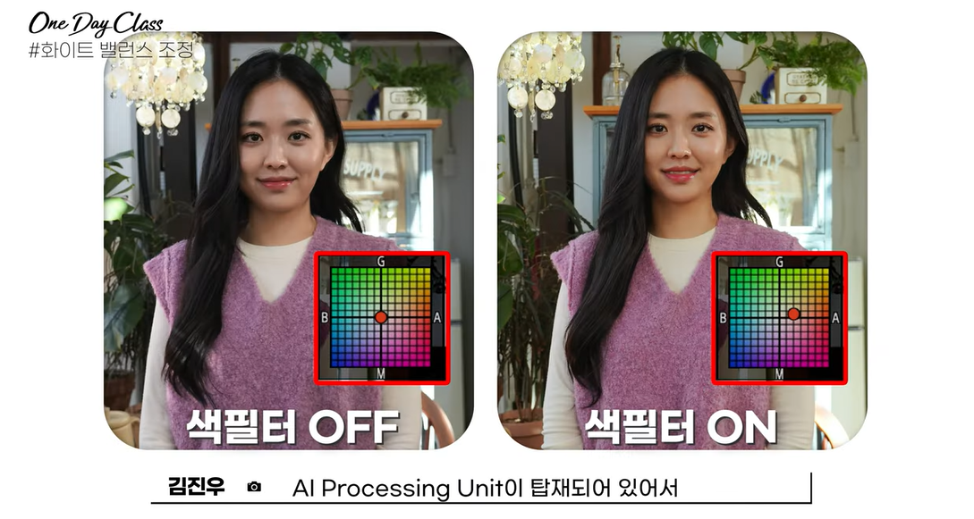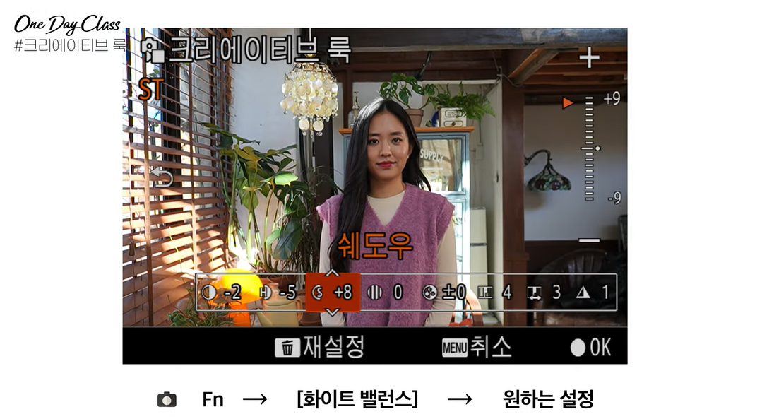 모드까지 설정 완료했으면 이제 크리에이티브 룩, 색필터로 색감을 보정해줍니다. 기존의 크리에이티브 룩 프리셋의 상세 설정값도 변경된다는 사실 알고 계셨나요? [Fn]-> [크리에이티브 룩]으로 들어가서 크리에이티브 룩의 하이라이트, 쉐도우를 조금씩 조정해보면서 나만의 색감을 찾아보세요. 또한 색필터 설정으로 색감을 조정할 수 있습니다. [Fn] -> [화이트밸런스]->오른쪽 화살표 [화이트 밸런스 조정]를 누르면 나오는 색감을 보정할 수 있는 포인트로 조정해줍니다.