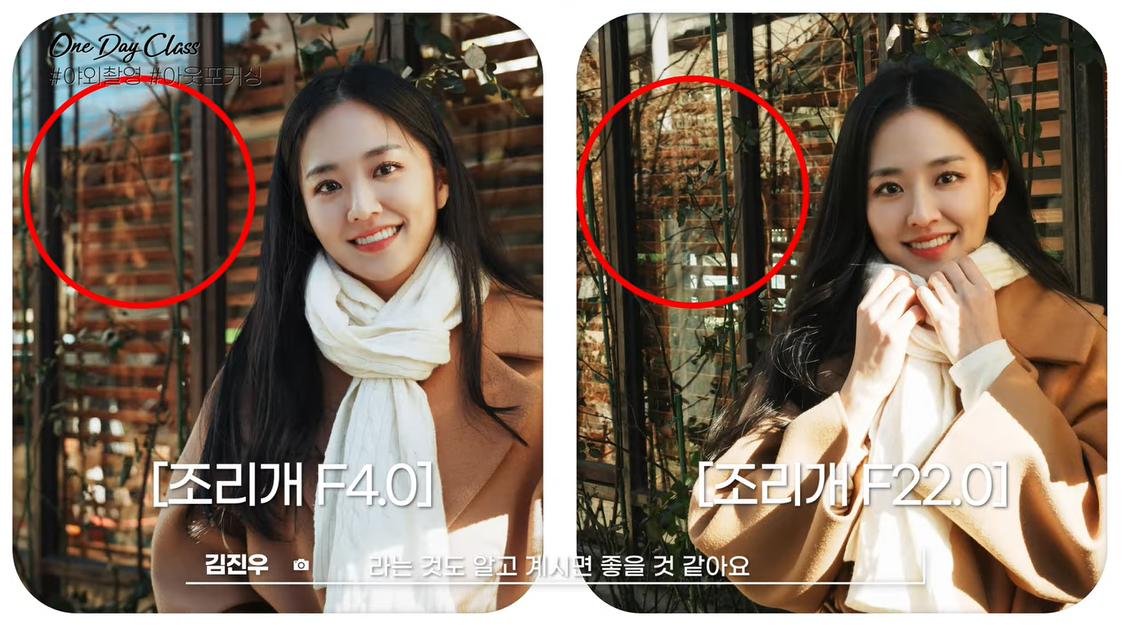 화각과 더불어 인물사진에 아름다움을 한 스푼 더하는 아웃포커싱은 조리개 값으로 조절할 수 있습니다. 조리개 F4.0과 조리개 F22.0의 차이가 보이시나요? 조리개 값이 더 낮을수록 배경이 흐려지면서 피사체를 더욱 돋보이게 담을 수 있습니다.