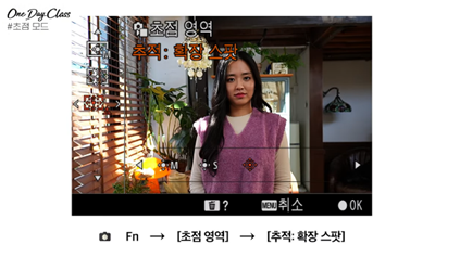 인물 사진을 위한 세팅법의 가장 첫번째는 초점입니다. 계속 움직이는 사람을 잘 잡아줄 초첨 세팅이 필요하죠. 초점 모드는 Fn-> [초점 모드]-> [AF-C]를 선택해 AF-C(연속 AF) 와 Fn -> [초점 영역] ->[추적 확장 스팟]에서 추적 확장 스팟으로 설정하면 움직이는 피사체도 놓치지 않고 깔끔하게 잡아냅니다.