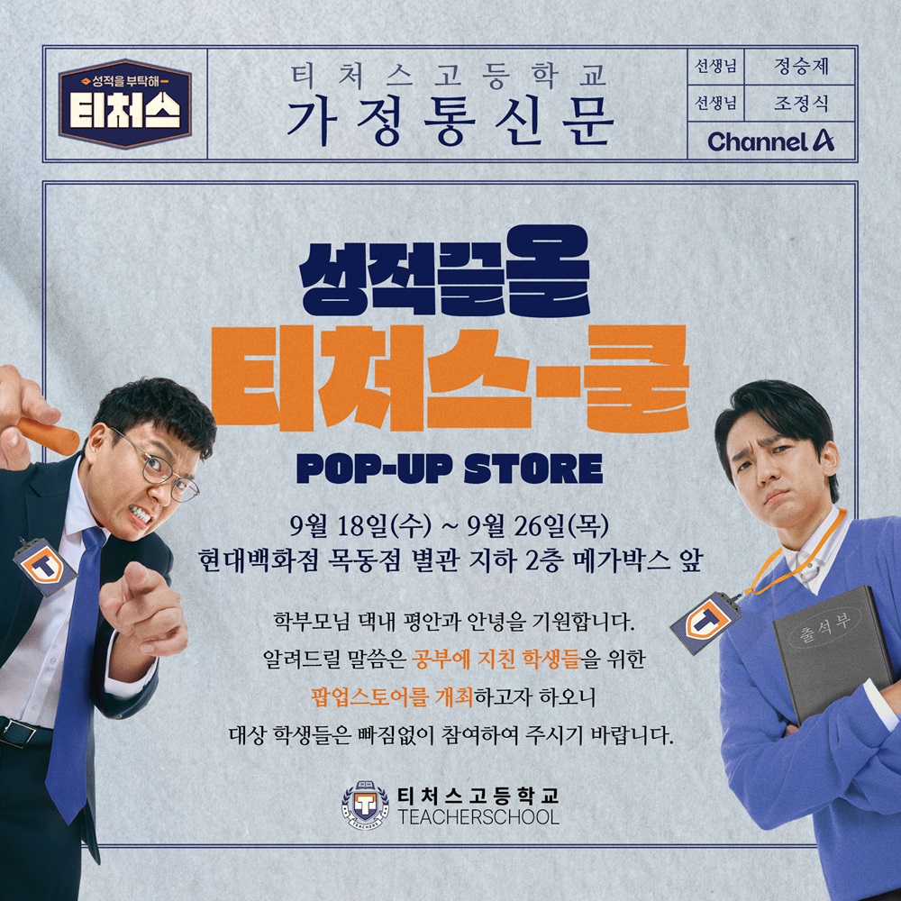 소니코리아가 채널A ‘성적을 부탁해 티처스’(이하 ‘티처스’)와 손잡고 오는 9월 18일(수)부터 26일(목)까지 현대백화점 목동점 지하 2층 그랜드스퀘어에서 운영되는 팝업스토어 ‘성적끌올 티처스쿨’에 참여한다고 13일 밝혔다.