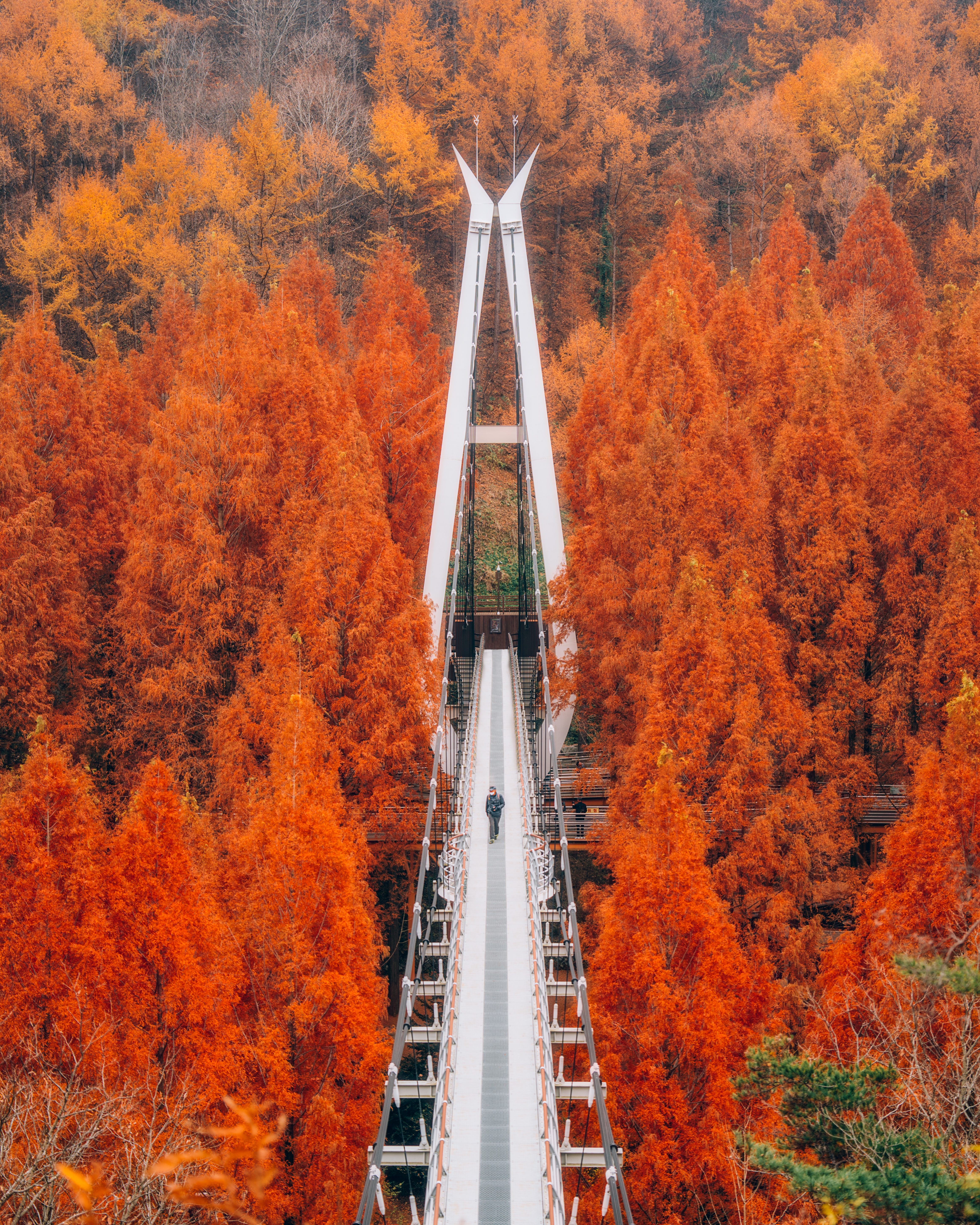 장태산은 대전광역시에 위치한 아름다운 자연 휴양림으로 가을이면 불타오르는 것처럼 붉게 물든 단풍이 절경을 이루는 곳으로 유명합니다. 많은 사람들이 장태산을 찾는 이유 중 하나는 하늘을 가까이에서 느낄 수 있는 스카이워크인데요. 단풍이 물든 숲을 위에서 내려다보는 색다른 경험을 할 수 있는 곳이죠. 스카이워크에서는 끝없이 펼쳐진 숲과 단풍의 풍경을 한눈에 담을 수 있어, 사진 촬영 명소로도 큰 인기를 끌고 있습니다.