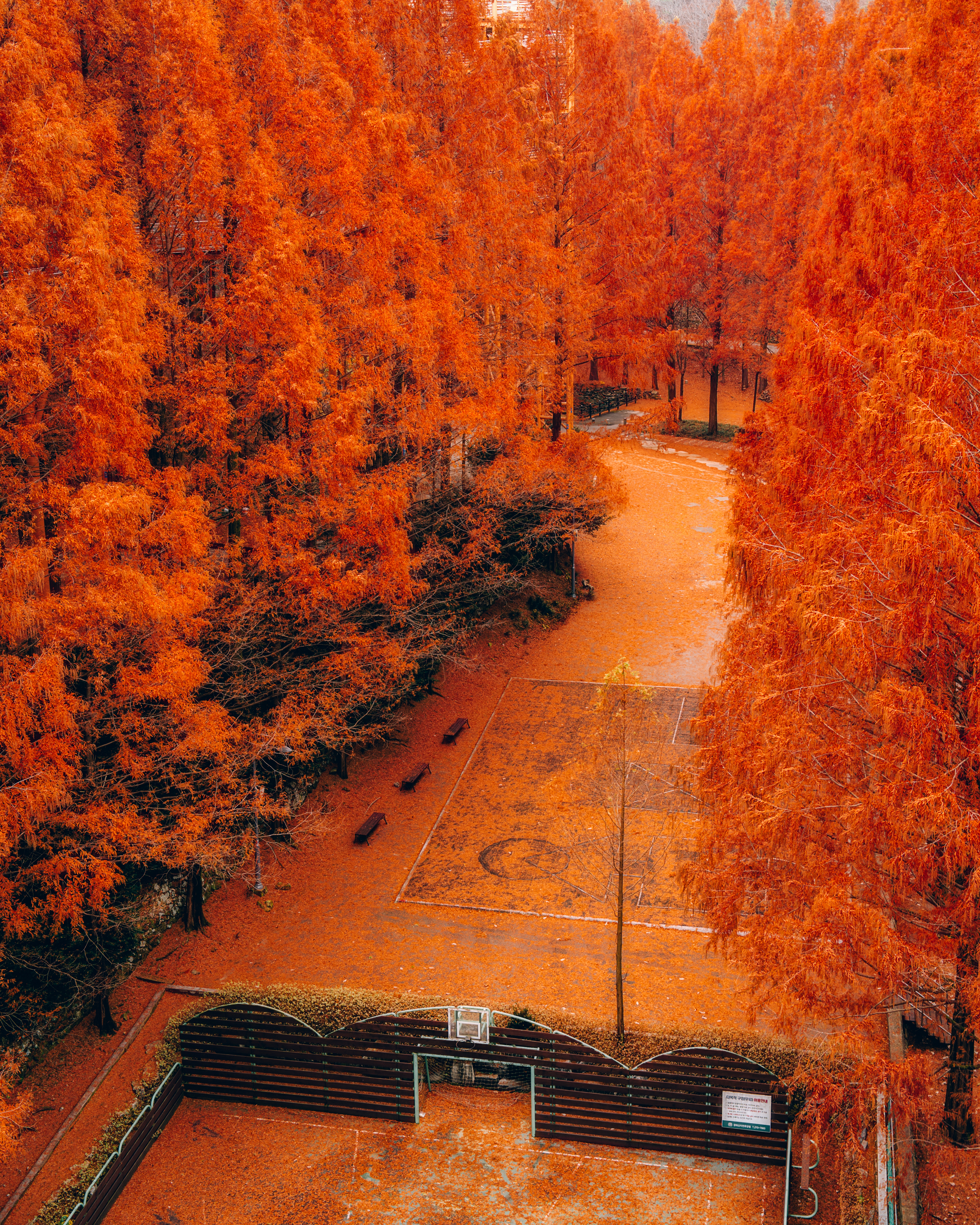 장태산을 빼곡히 채운 메타 세쿼이아 숲길은 가족이나 연인과 함께 여유를 즐기기 좋은 장소입니다. 가을이 되면 붉은 단풍이 메타 세쿼이아 나무들과 어우러져 이국적인 분위기를 자아내죠. 길게 이어진 산책로를 따라 걸으며 울긋불긋한 단풍에 둘러싸여 자연 속에 깊이 빠져보세요.