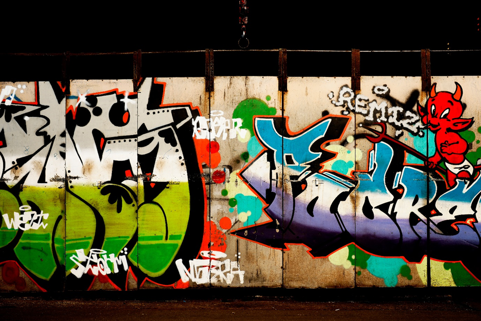 촬영을 한 시간적 배경이 밤이나 주간인 경우 시원한 느낌의 파란색을 강조하는 편입니다. 반대로 일출이나 일몰 시간대에는 붉은 톤을 강조하죠. 시원한 느낌을 주기 위해 켈빈값은 푸른색으로 표현되는 2800K ~ 4000K 사이에서 배경의 색을 선택하고, 세부 설정은 주제가 되는 색을 살리기 위해 켈빈값과 반대되는 색인 붉은 톤을 강조하였습니다. Amber의 색인 A 방향으로 움직여 아래와 같은 사진을 찍었답니다. 어두운 밤이지만, 낡은 콘크리트 벽 위를 가득 채운 그래피티의 붉은 색과 푸른색의 대비가 아주 선명하게 표현되고 있습니다.