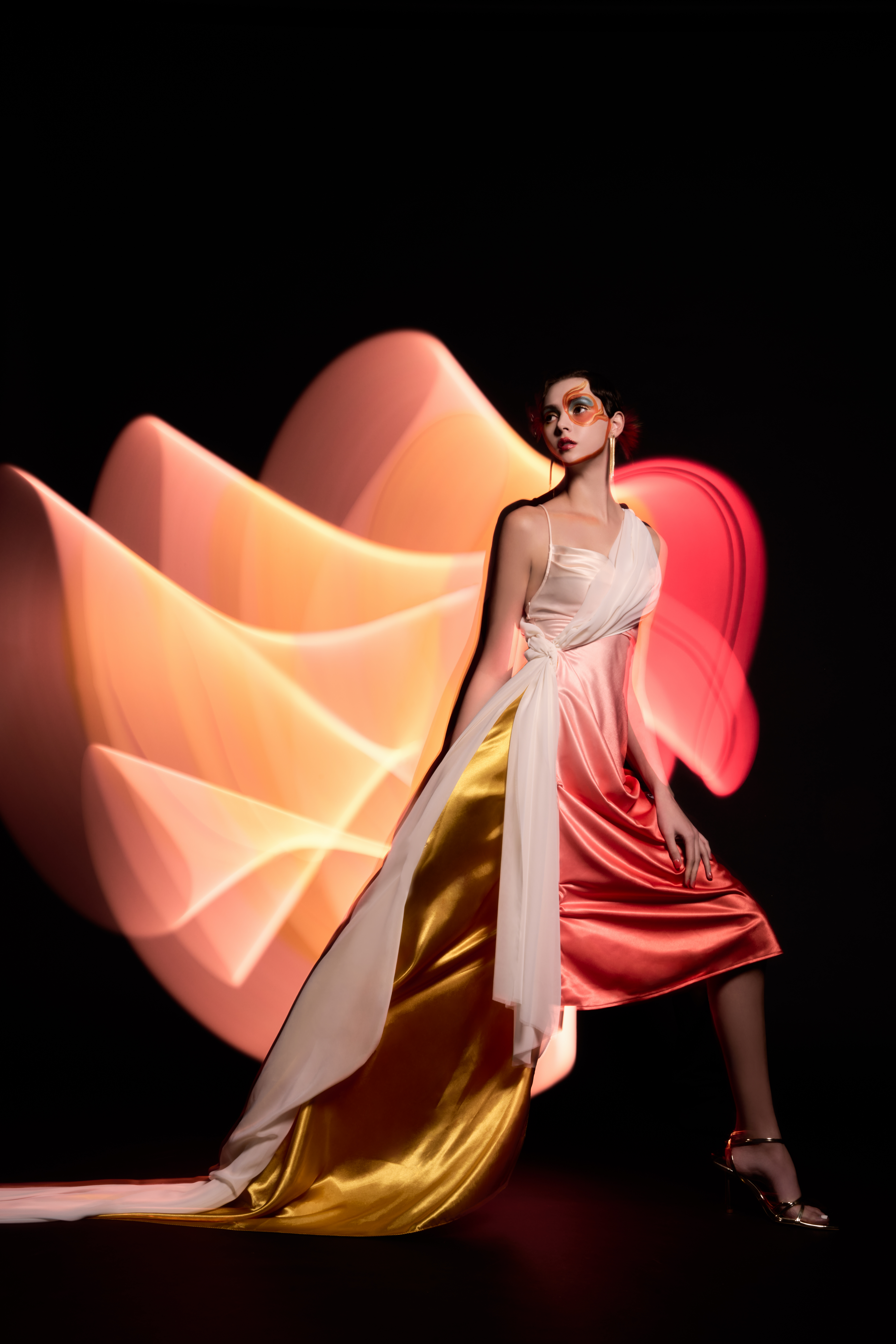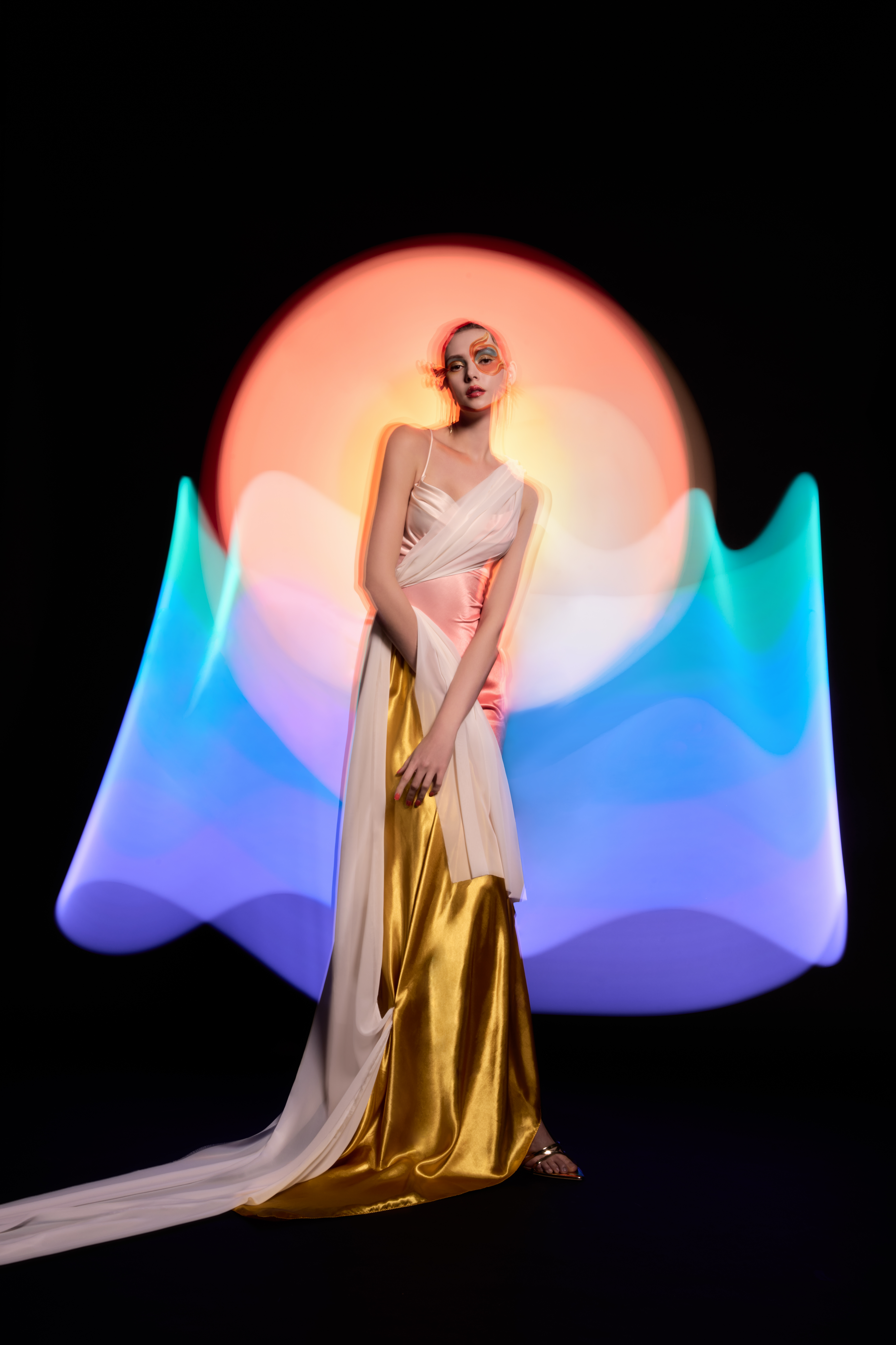라이트 페인팅 기법은 라이트의 바 라이트를 활용해, 순간광으로 선막을 터트리는 기법입니다. 모델의 포즈를 잡아내고 셔터 스피드를 6초 정도로 느리게 설정한 다음에 셔터가 닫히기 직전까지 바 라이트로 패턴을 만들어냅니다. 굉장히 재미있고 특별한 무드가 나오기 때문에 많은 분들이 이런 방법으로 촬영에 활용해 보시면 좋을 것 같습니다.
