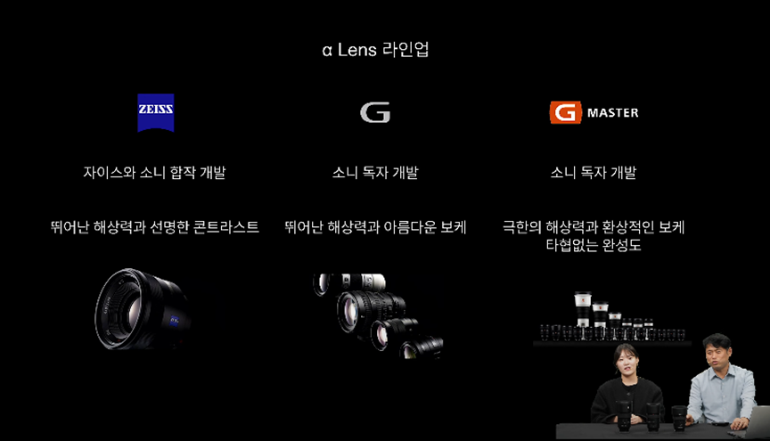소니는 E-마운트를 기반으로 다양한 렌즈를 제공하며, 크게 세 가지 라인업으로 나뉩니다. 바로 독일 광학 기술로 설계된 자이즈(ZEISS) 렌즈, 소니 독자 기술로 완성한 G 렌즈, 그리고 이 G 렌즈의 성능을 한층 더 극대화한 G Master(G 마스터) 라인업입니다.