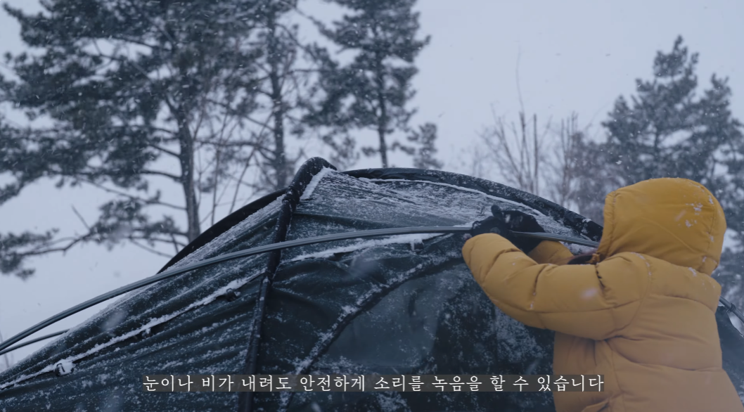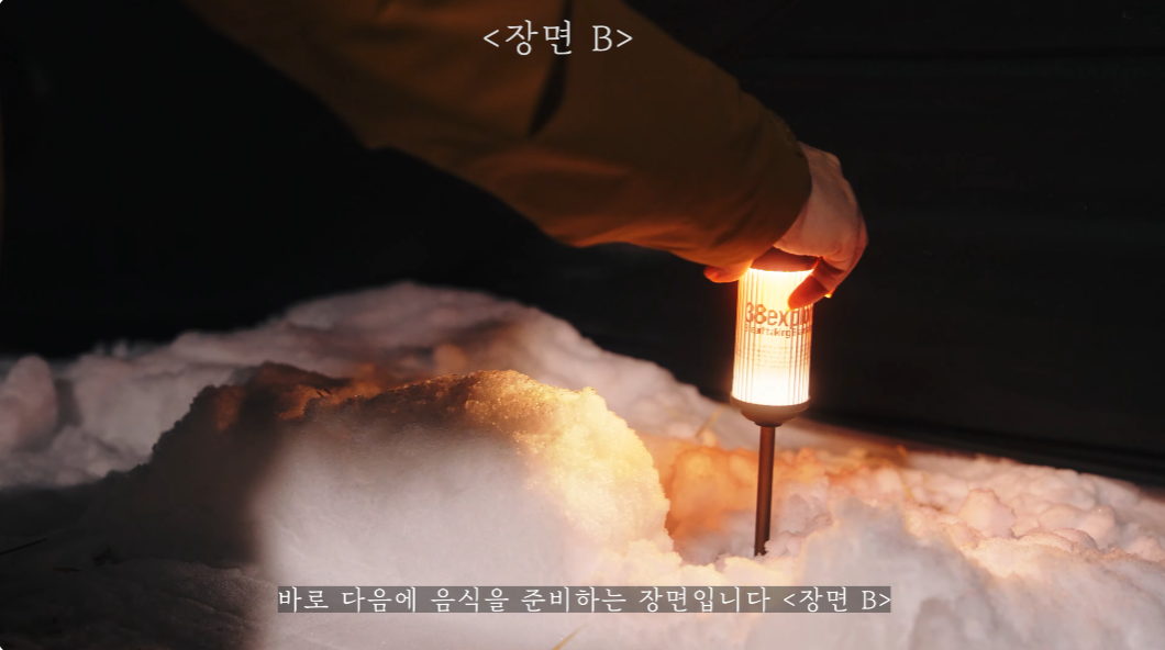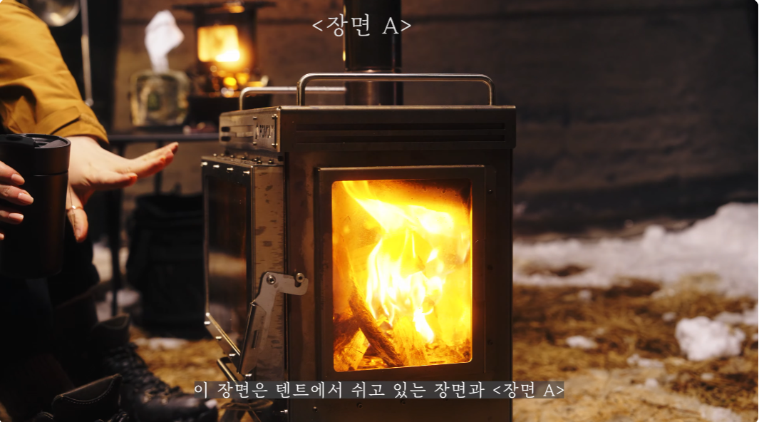 텐트에서 쉬고 있는 장면 바로 다음에 음식을 준비하는 장면이 이어지는데요. 이 사이에 컷 어웨이 샷으로 화목난로 영상을 넣어 추운 겨울 눈보라 치는 텐트밖의 정경을 보여주며 겨울 캠핑의 분위기를 한 번 더 살려주는 것이죠.