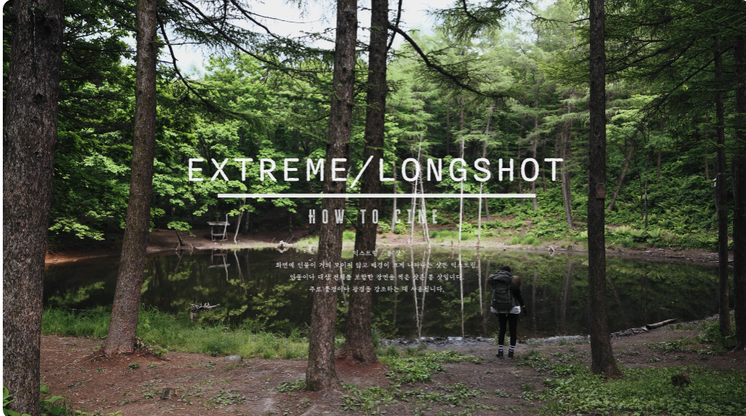 익스트림 롱샷은 풍경이나 배경이 되는 곳을 멀리서 잡은 샷으로 영상 초반 캠핑사이트의 아름다운 풍광을 보여주고 넓은 영역에서 활동하는 모습을 보여주기 위해 촬영하는 구도입니다. 렌즈의 화각을 폭넓게 활용하여 캠핑 장소의 넓고 웅장한 풍경을 담아보세요. 시청자들에게 캠핑하는 공간의 매력을 생생하게 전달할 수 있습니다.