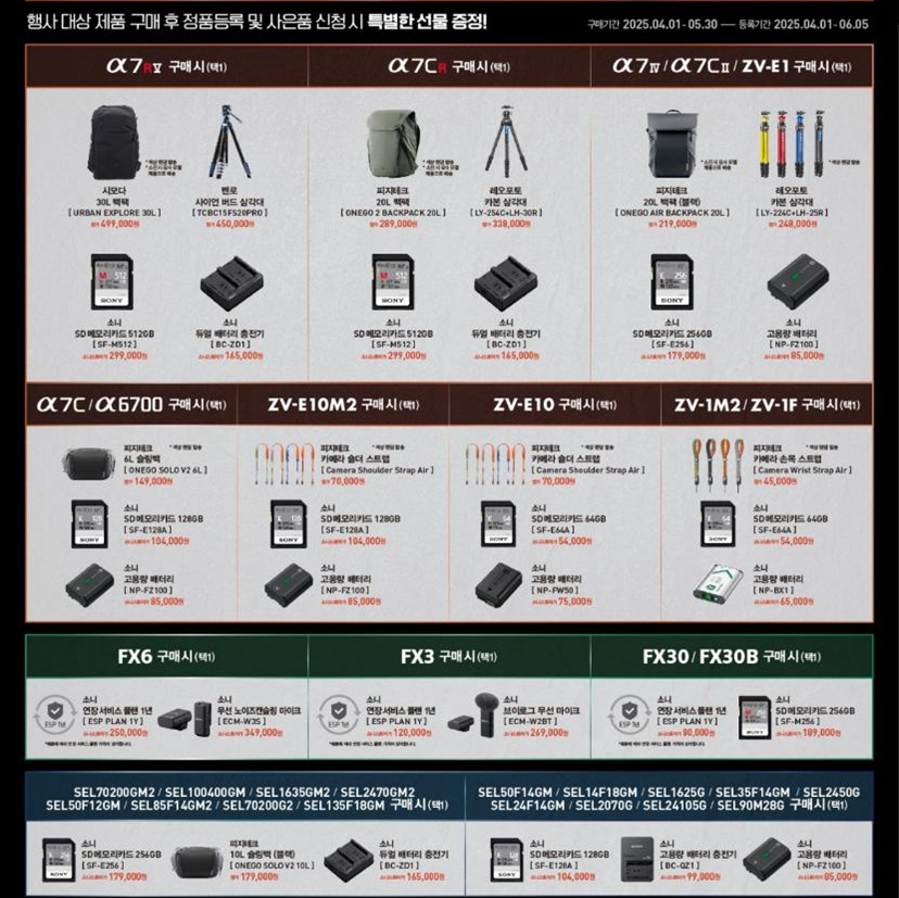 이에 소니코리아는 고객들의 성원에 보답하고자 폭넓은 제품 라인업과 풍성한 혜택을 담은 정품등록 프로모션을 기획했다. 이번 프로모션은 알파 카메라 6종(Alpha 7R V, Alpha 7CR, Alpha 7 IV, Alpha 7C II, Alpha 7C, Alpha 6700)과 ZV 카메라 5종(ZV-E1, ZV-E10M2, ZV-E10, ZV-1M2, ZV-1F), 시네마 라인 카메라 4종(FX6, FX3, FX30, FX30B), GM렌즈 및 G렌즈 17종을 대상으로 진행한다.