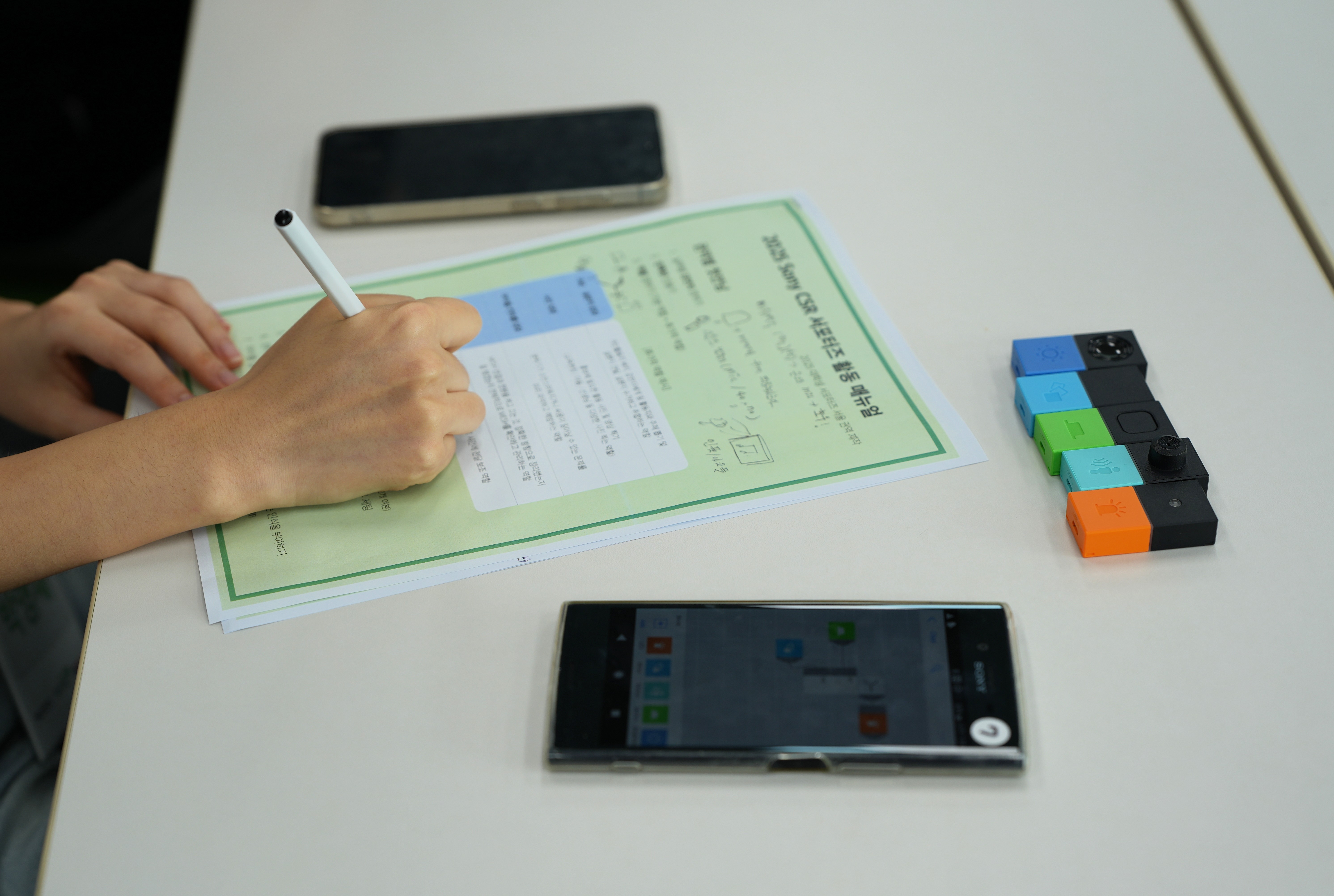 소니 CSR 대학생 서포터즈도 팀을 이루어 실제로 키트를 이용해 실습해보았습니다. 소니의 IoT 기술을 직접 체험해보고, 이걸 어떻게 하면 아이들에게 쉽게 가르칠 수 있는지 다양한 팁을 주고받았죠. 특히 올해부터는 대학생 서포터즈를 위한 교안이 새롭게 제작되었는데요.