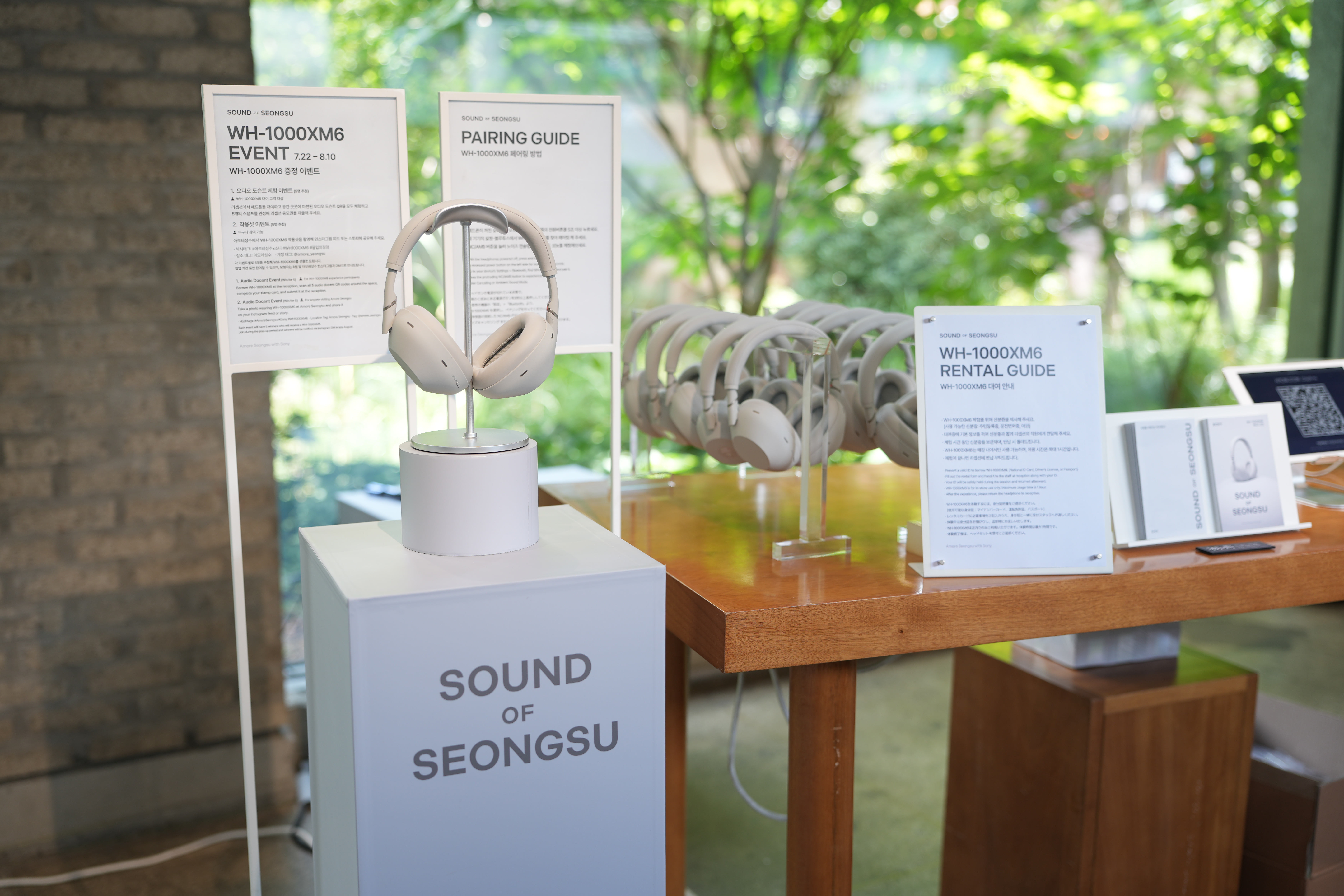 소니 팝업 현장 <사운드 오브 성수>의 입구를 들어서자마자 소니의 최신 플래그십 무선 헤드폰 WH-1000XM6가 여러분을 반긴답니다.