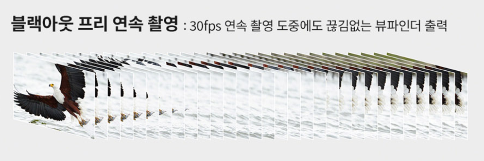 - 블랙아웃 프리 30fps 연사: 초당 30프레임의 고속 연사 중에도 뷰파인더(EVF)가 암전 되지 않는 블랙아웃 프리로 마치 동영상을 찍는 듯, 매끄럽게 결정적인 순간을 포착해 낼 수 있습니다.