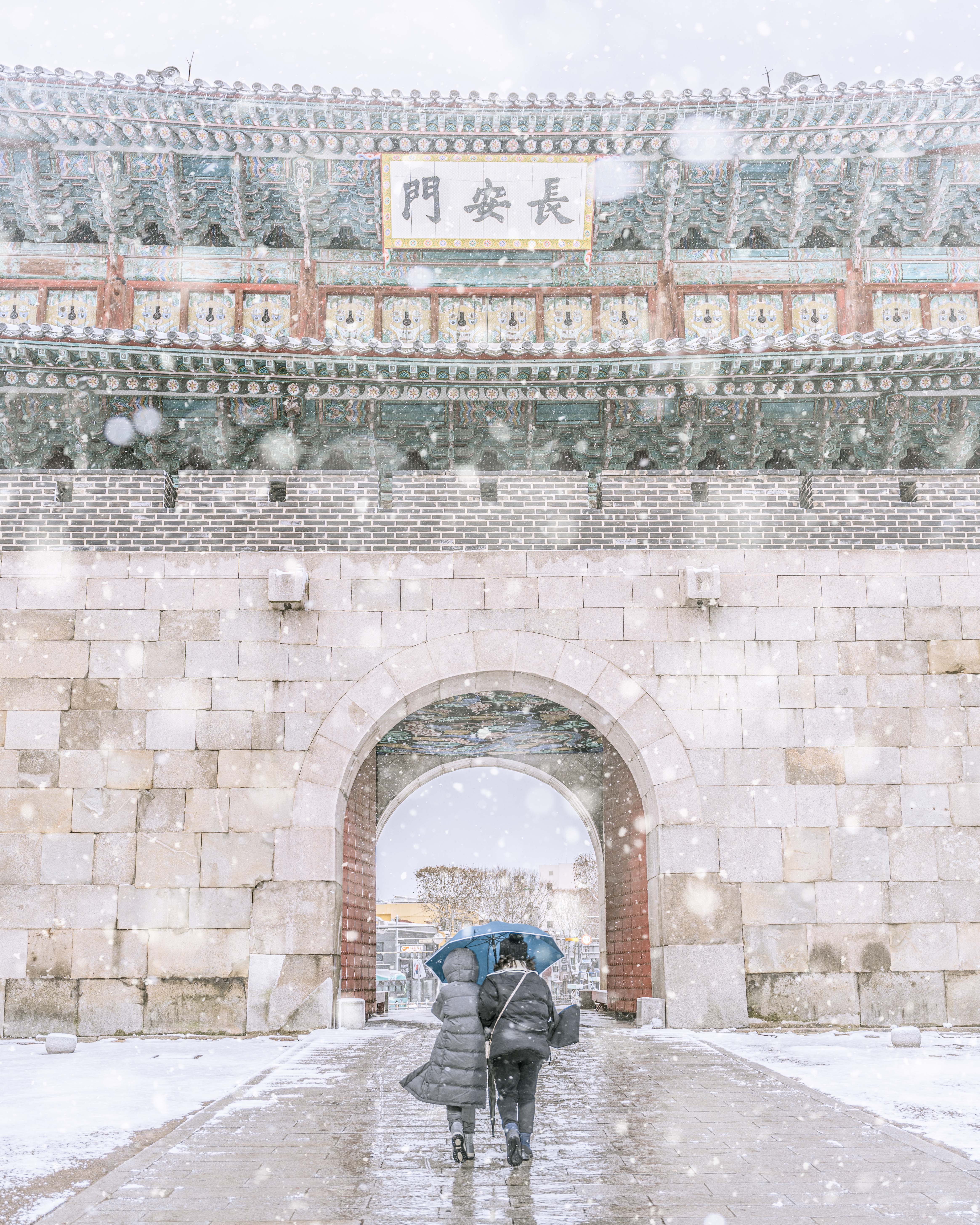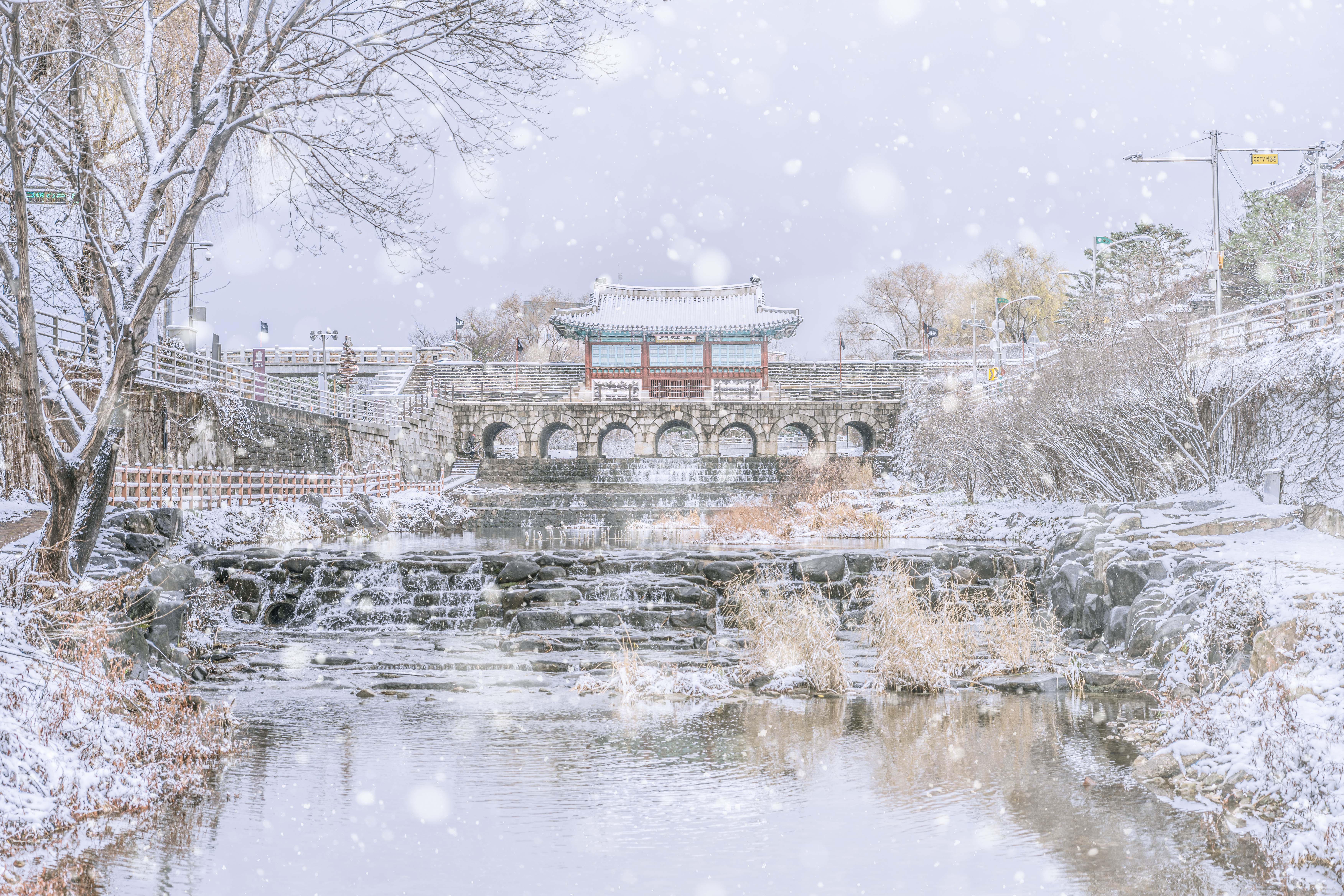 화홍문을 따라 흐르는 수원천을 걷다 보면 겨울에만 느낄 수 있는 고요한 풍경을 만나게 됩니다. 얼어붙은 연못 주변으로 내려앉은 눈과 정자의 모습을 함께 담으면 과거로 시간 여행을 온 듯한 신비로운 설경을 마주할 수 있습니다.