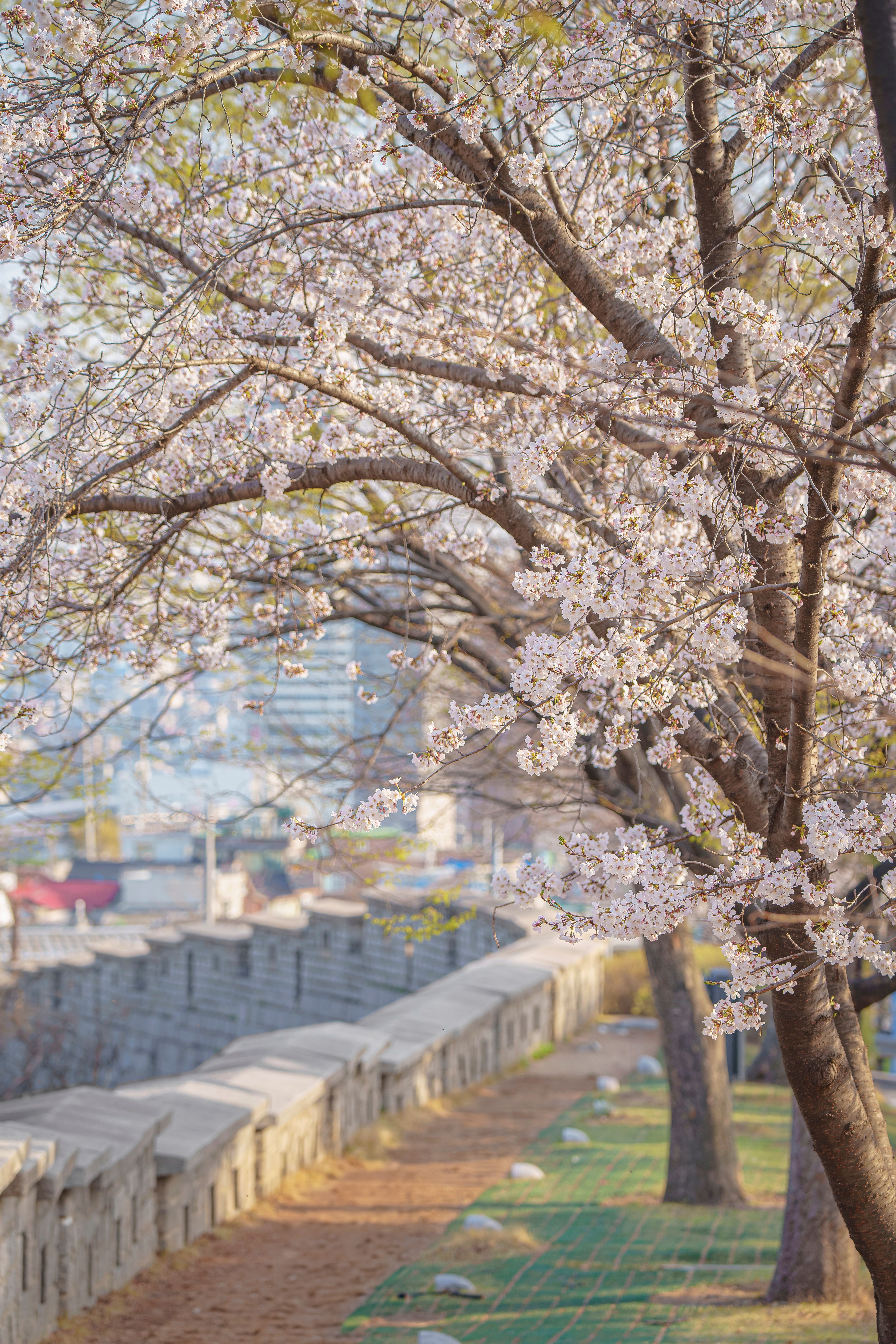 낙산공원은 야경으로도 유명하지만, 화창한 낮 시간에 마주하는 벚꽃 풍경은 그보다 훨씬 청량하고 생동감 넘치는 매력을 선사합니다. 성곽길을 따라 끝없이 이어지는 벚꽃 나무들이 파란 하늘과 대비를 이루며 눈부신 분홍빛 길을 만들어냅니다.