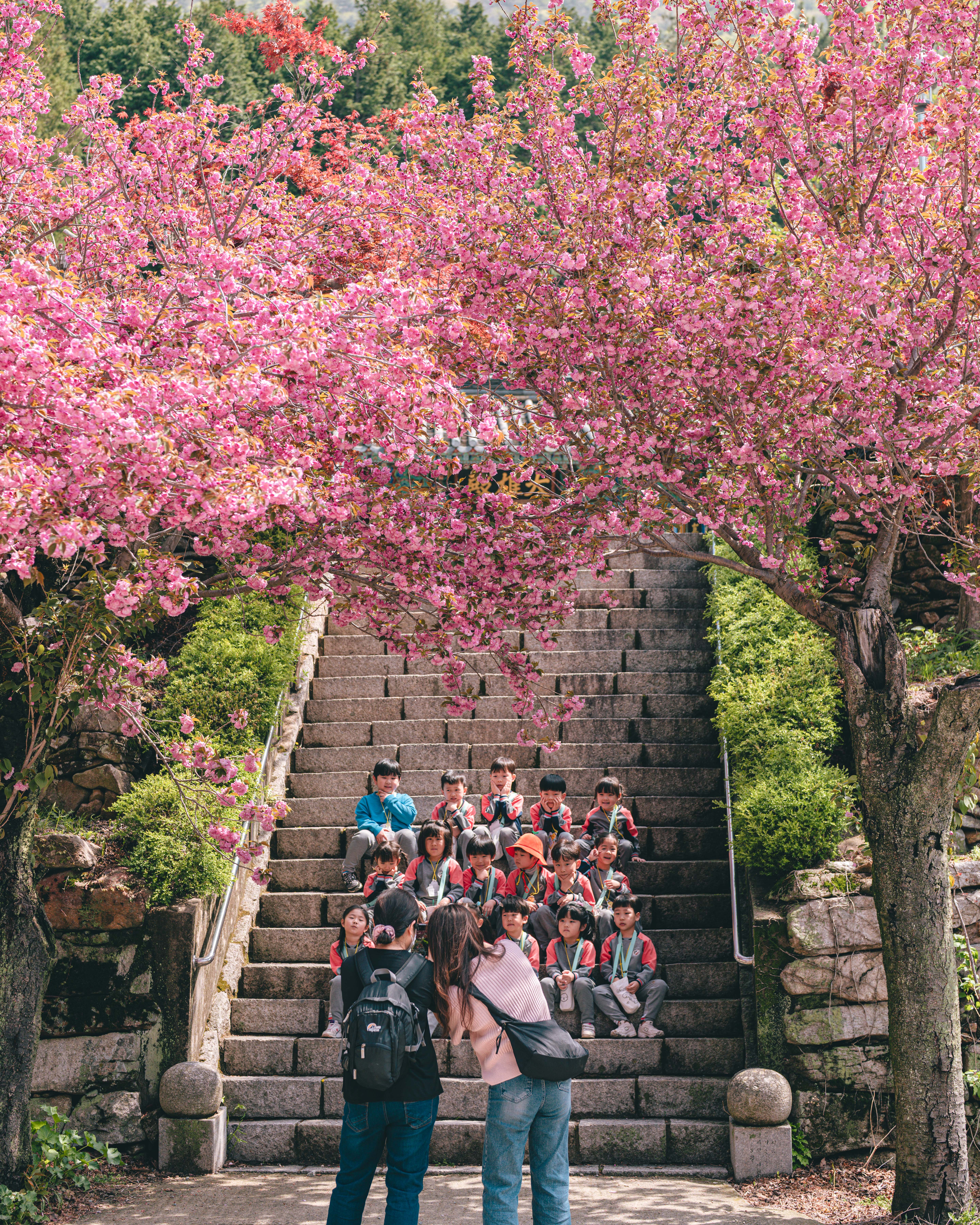 청룡사의 백미는 사찰로 올라가는 계단 양옆으로 늘어선 겹벚꽃 나무들입니다. 마치 솜사탕을 뭉쳐 놓은 듯 몽글몽글한 꽃송이들이 머리 위로 자리하고 있어, 걷는 내내 분홍색 동화 속 세상에 들어온 듯한 느낌을 불러 일으키죠.