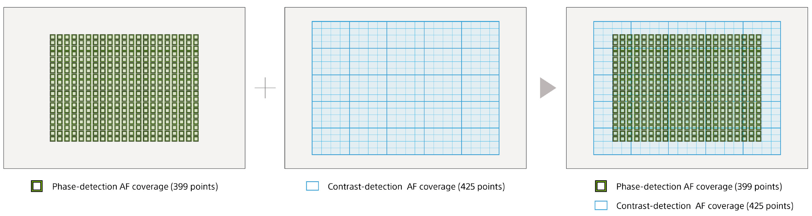 하지만 소니 미러리스 카메라의 경우 화면 대부분의 영역에서 위상차 검출 AF와 콘트라스트 검출 AF를 지원하기 때문에 중앙 측거점이 아닌 주변부의 초점 포인트를 사용해서도 초점을 검출할 수 있습니다. 위에 보이는 이미지는 A7R3에서 초점 검출이 가능한 영역을 표기한 것으로 실제 촬영 시 중요한 피사체가 있을만한 곳은 모두 초점 검출이 가능하기 때문에 매크로 촬영 시에도 AF로 초점 검출이 가능합니다.