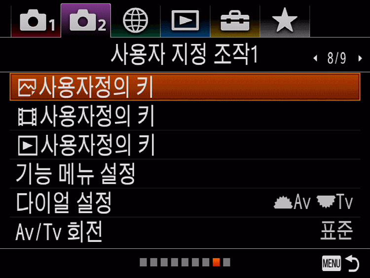 먼저 해야 할 것은 카메라의 할당된 버튼의 기능을 바꿔주는 것입니다. <사용자정의 키> 메뉴를 찾아야 하는데 이는 보통 카메라 설정2 메뉴에서 찾으실 수 있습니다. (기종에 따라 사용자정의 키 메뉴의 위치는 상이할 수 있습니다.)