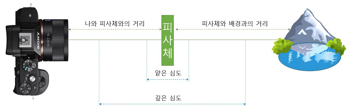 사진에서는 렌즈로 어떤 거리의 피사체에 초점을 맞추었을 때 그 앞쪽과 뒤쪽의 일정한 거리 내에 초점이 맞는 범위를 피사계 심도(DOF, Depth of field)라고 하며 그 범위가 좁으면 얕은 심도, 넓으면 깊은 심도라고 표현합니다. 흔히 아웃포커싱이라고 이야기 하는데 이것은 얕은 심도에서 피사체 뒤로 배경이 흐려지는 것을 의미합니다.