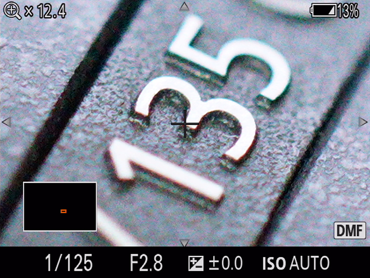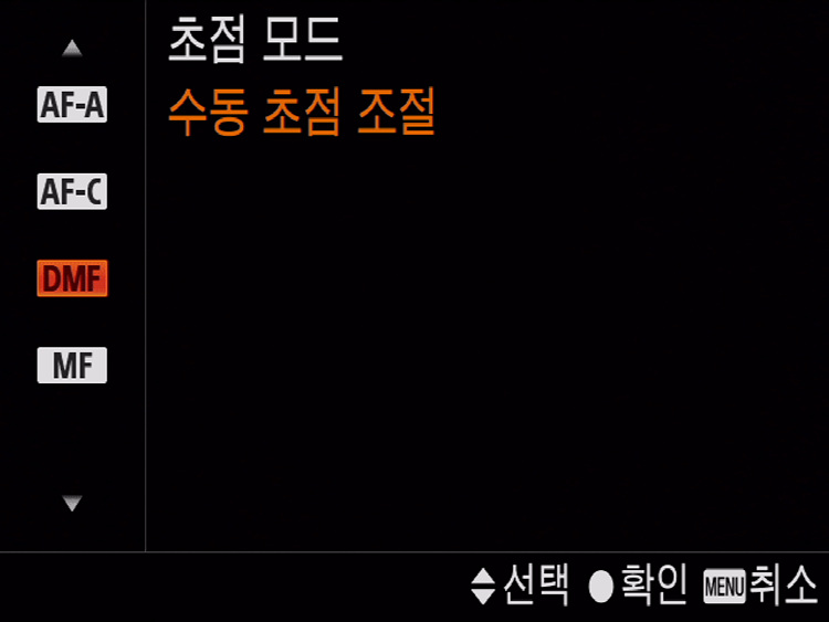 아래쪽 버튼을 누르면 DMF 모드 시 컬러 피킹이 ON / OFF 되어 피사체에 초점이 맞는 포인트를 구별하는 것이 쉬우며, 초점 고정 버튼은 렌즈 옆에 있는 버튼으로 초점 부분 확대가 된 상태로 AF 검출을 할 수 있어 매크로 촬영 시 매우 편리합니다.