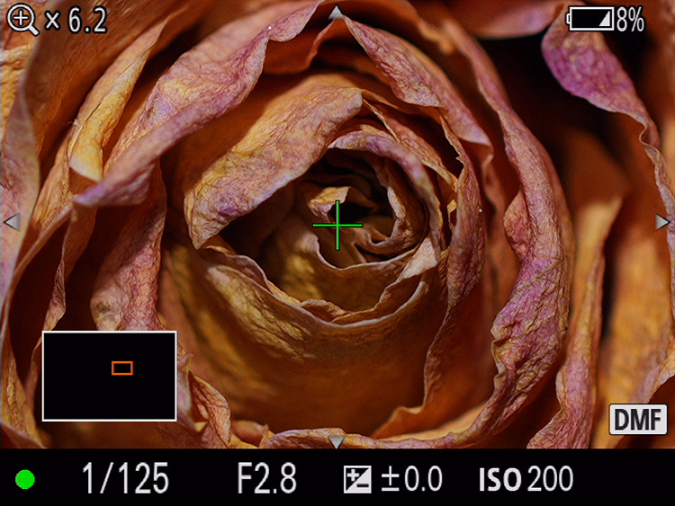 많은 사진가들이 매크로 촬영의 경우 MF(Manual Focus: 수동 초점)로 촬영해야 한다고 알고 있는데 이것은 사실 잘못된 상식입니다. 왜냐하면 매크로 촬영을 MF로 했던 이유는 초점 포인트의 위치가 제한적인 SLR 카메라의 경우 심도가 얕은 매크로 촬영 시 코사인 오차 때문에 AF(Auto Focus: 자동 초점) 로 매크로 촬영하는 것이 불가능했기 때문에 MF를 선택할 수밖에 없었기에 매크로 촬영은 MF로 해야 한다는 것을 정석처럼 여겨져 왔지만 미러리스 카메라의 경우 SLR 카메라와 달리 초점 포인트의 위치를 자유롭게 이동시킬 수 있기 때문에 AF로도 오차 없이 충분히 매크로 촬영을 할 수 있기 때문입니다. 즉, SLR 카메라는 매크로 촬영을 AF로 할 수 없어서 MF로 촬영했던 것이므로, 미러리스 카메라에서는 AF로 편하게 촬영하면 됩니다.