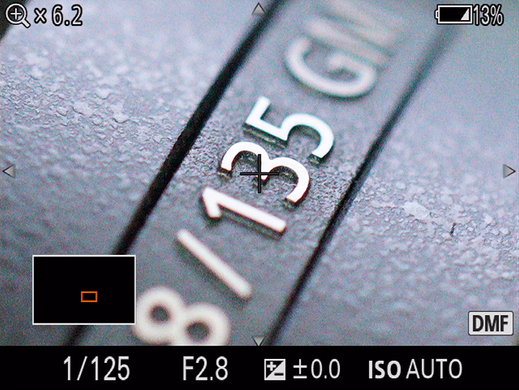2. 렌즈 옆의 초점 고정 버튼을 눌러서 초점 포인트를 확대한 후 반셔터를 눌러서 초점을 검출합니다.
