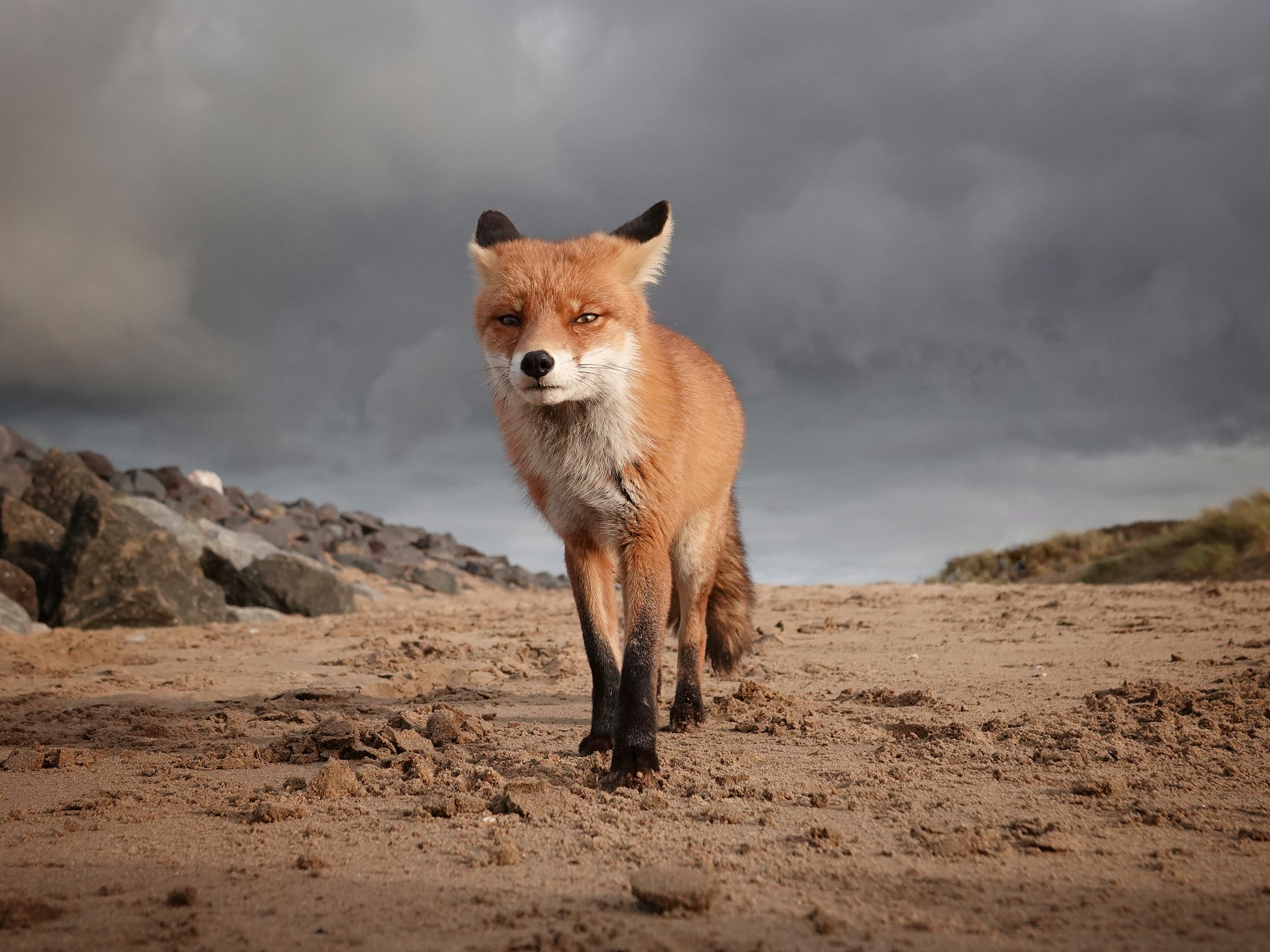 “먹구름에 맞닿은 모래와 바위의 색깔이 여우의 아름다움을 더욱 돋보이게 하는 것 같았죠. 저는 낮은 자세를 취하고 여우가 저를 향해 걸어오기를 기다린 끝에 사진을 찍을 수 있었습니다. 그야말로 완벽한 명암의 순간이었죠.”