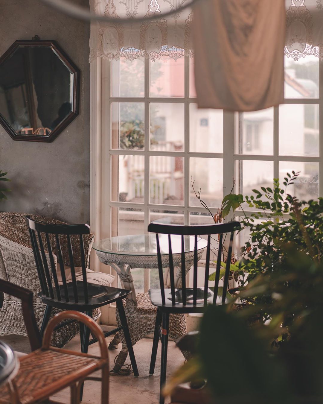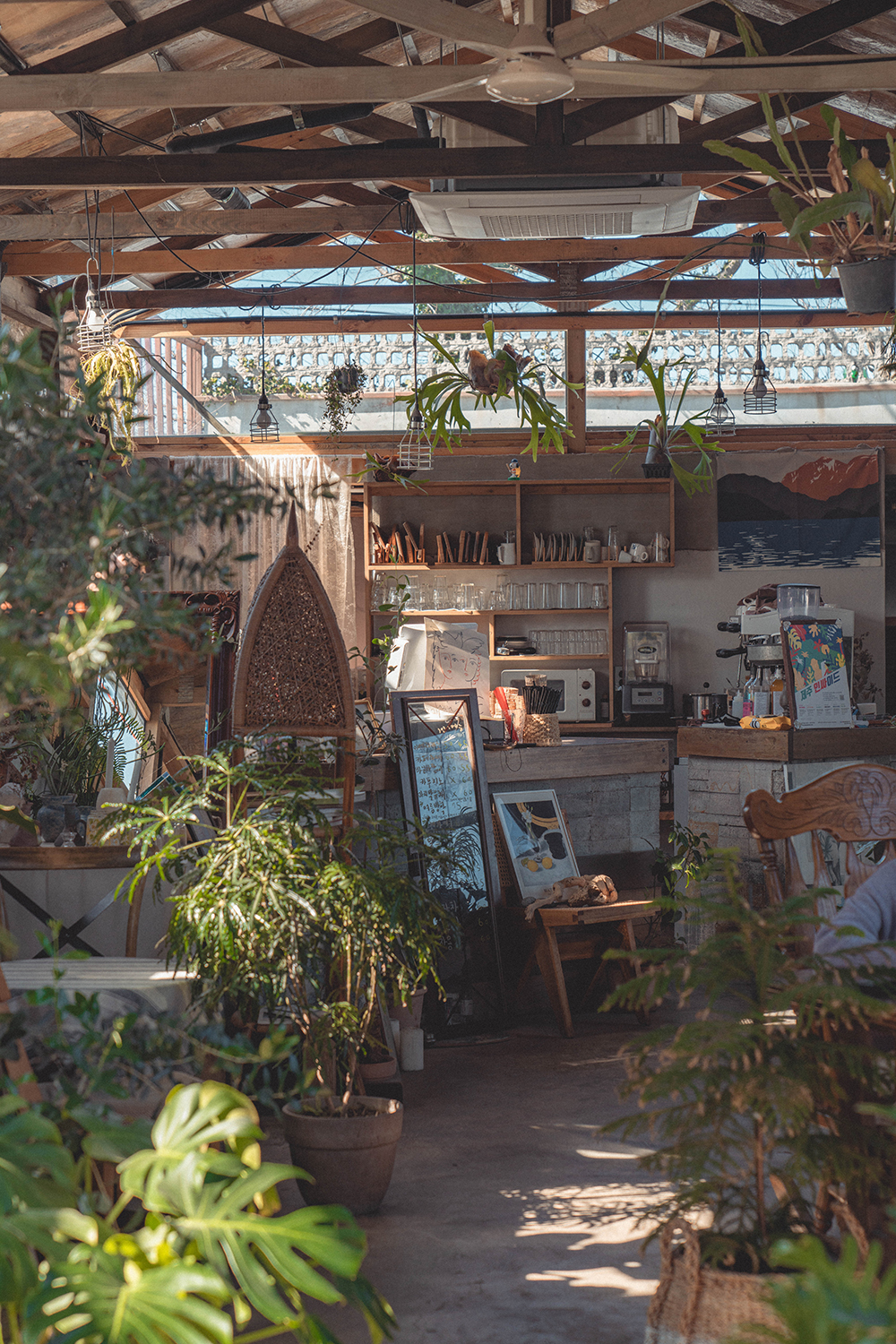 테이블 사이의 나무가 곳곳에 배치되어 있어 독립된 공간으로 느껴지고, 창문에서 들오는 햇빛으로 나뭇가지와 잎이 그림자로 지는 건 실제로 보면 정말 환상 속 한 장면에 들어오는 듯한 느낌을 받을 수 있습니다. 제주도 하면 푸른 바다도 좋지만 이런 플랜테리어는 어떠세요?