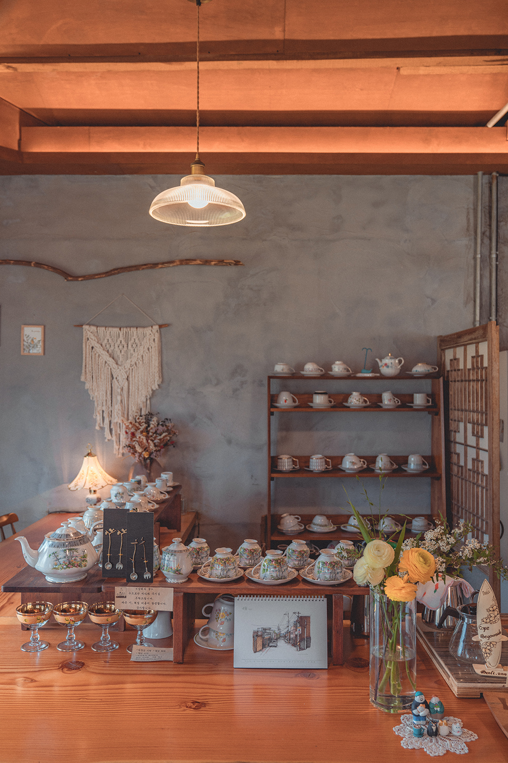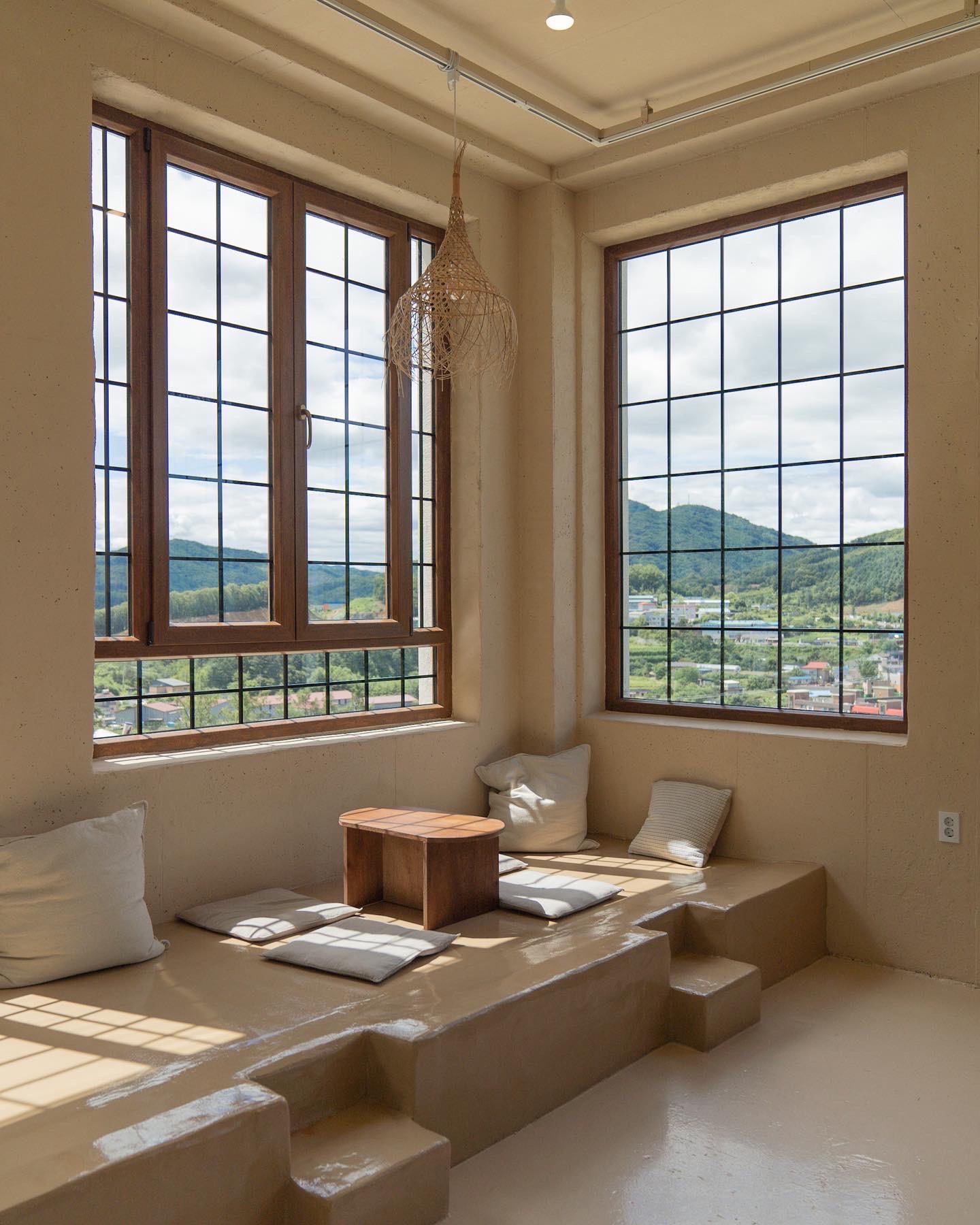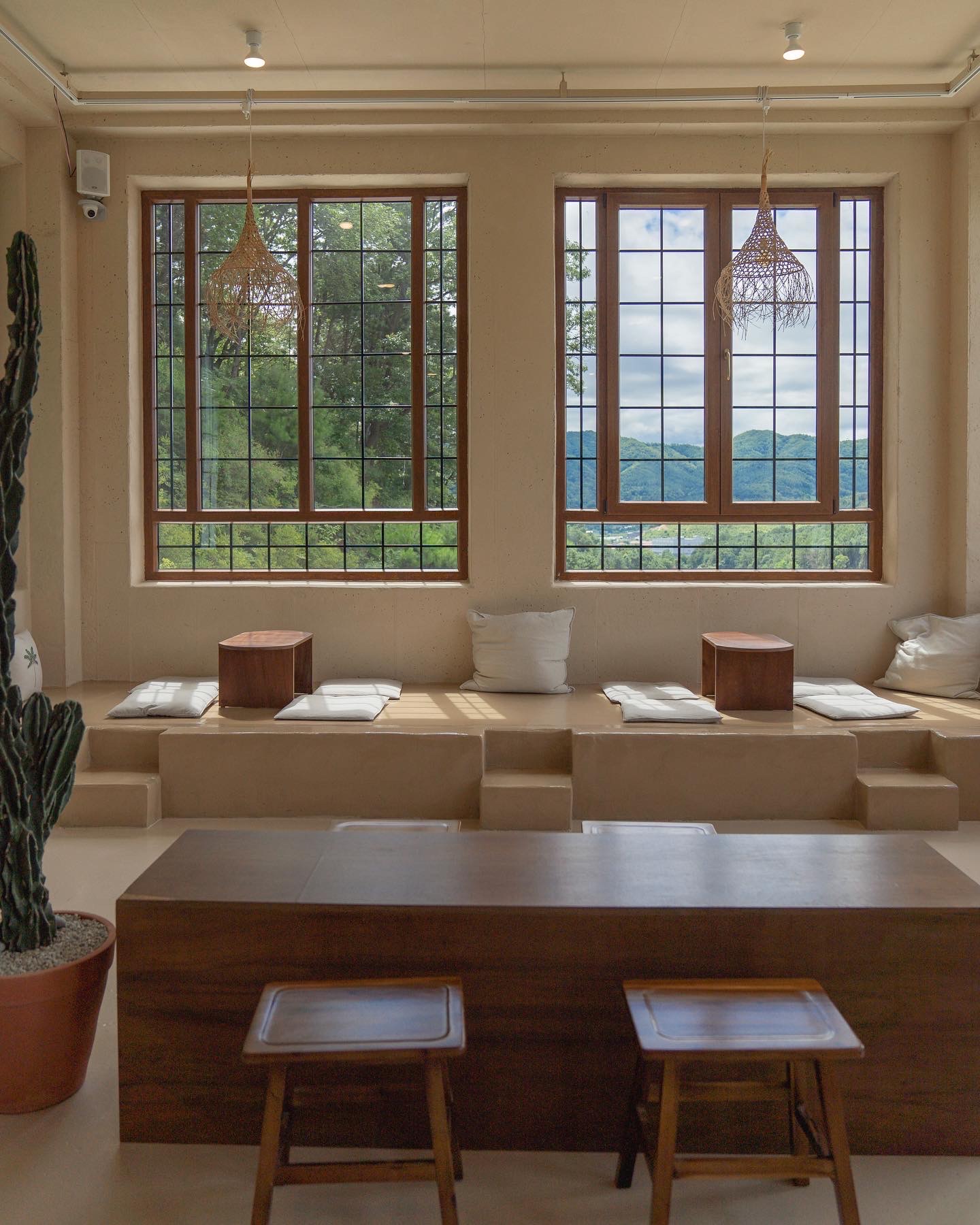 특히 이곳은 햇빛이 쏟아지는 낮 시간대에 가면 더욱 따스한 느낌을 받아 한 폭의 그림을 보는 듯한 착각마저 들게 하는데요. 특히 높은 층고와 베이지 빛 벽의 포근함, 그리고 라탄 조명이 내부를 한층 더 따스하게 만들어주는 느낌을 줍니다.