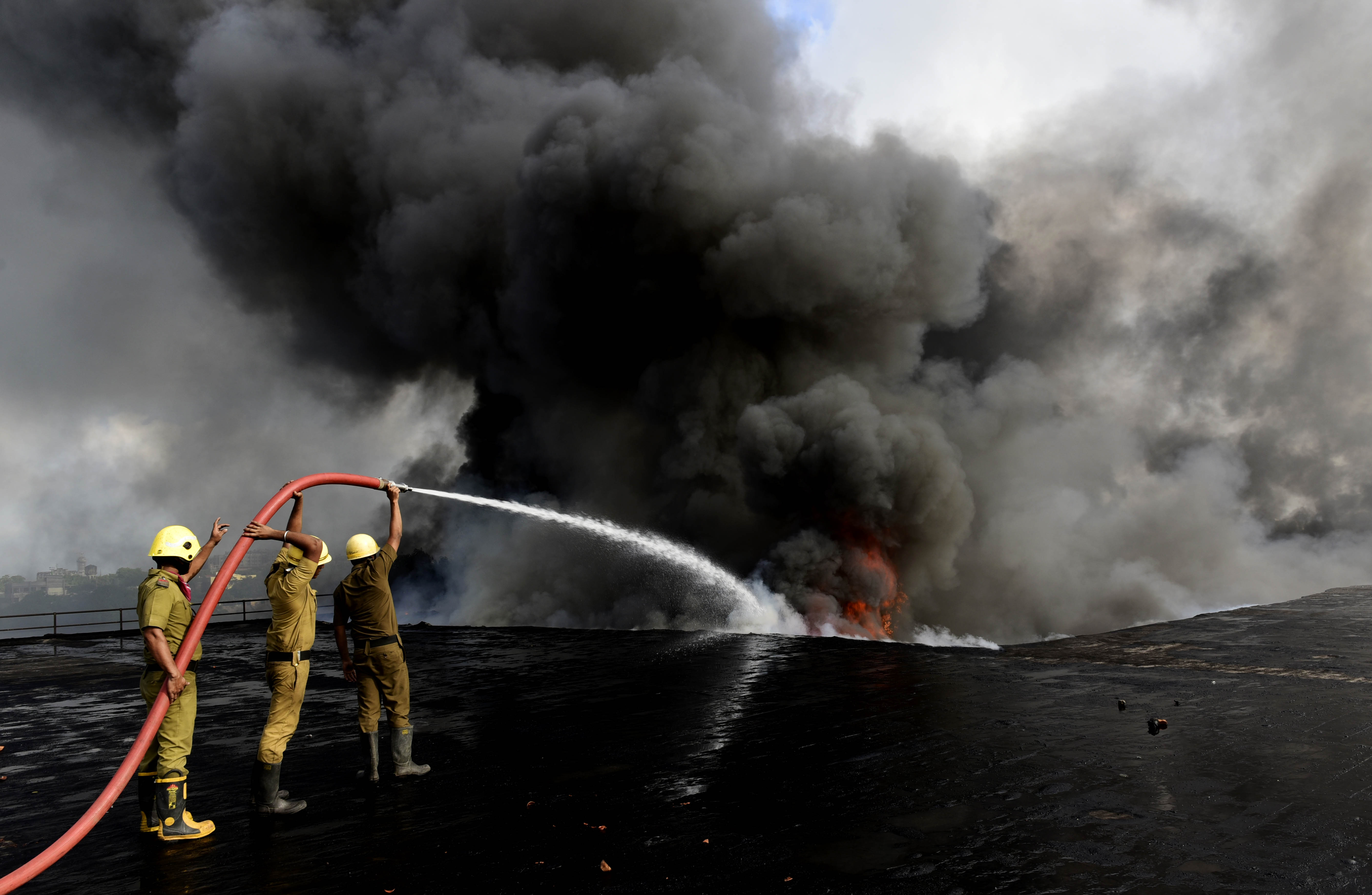 화재 현장을 향해 달려나가는 물줄기와 저 멀리서 솟아오르는 검은 연기가 그 당시 화재의 긴급성을 보여주는 것 같습니다.