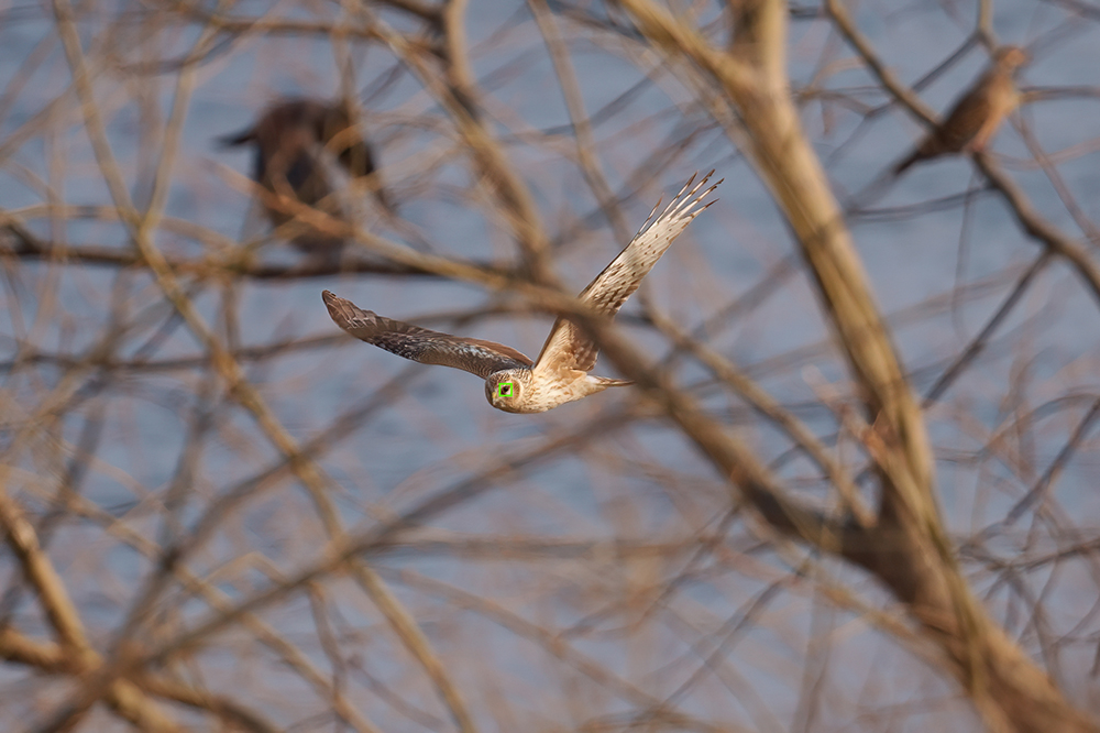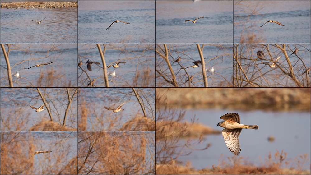 위 사진은 리얼타임 트레킹을 이용하여 연속 촬영한 사진입니다. 잿빛개구리매가 정면으로 다가오다가 좌측 나뭇가지 뒷편으로 들어가는 상황에서도 추적이 지속되어 다양한 모습을 담을 수 있었는데요. DSLR은 이렇게 갑자기 대상이 사라진 경우 잠시 AF 검출을 지연시켜 임기응변식으로 처리합니다. (복잡한곳, 나뭇가지 때문에 사라졌다면 대상에 대한 지속적인 AF 검출은 사실상 중단되었다는 이야기입니다.)