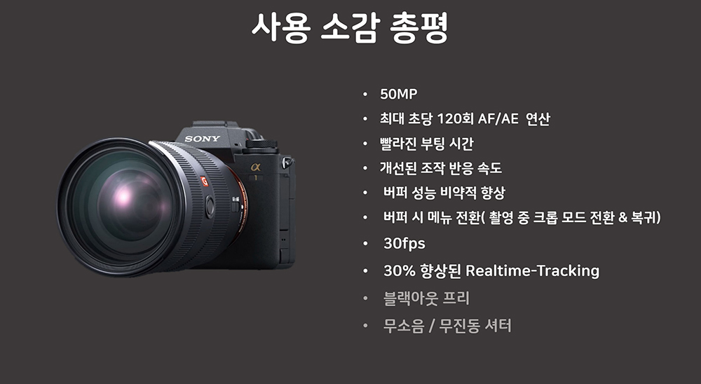 a1은 기존 소니 카메라의 부족한 부분을 거의 모두 개선하고, 스펙상으로 초격차를 보여준 제품입니다. 50MP와 30연사가 가장 대표적이라 할 수 있고, 초당 120회의 속도로 AF/AE 연산을 할 수 있습니다. 듀얼 BIONZ XR와 최적화로 조작 반응 속도와 부팅시간도 상당히 개선되었습니다. 기존의 블랙아웃 프리와 무소음 /무진동 셔터는 변함없이 지원합니다.