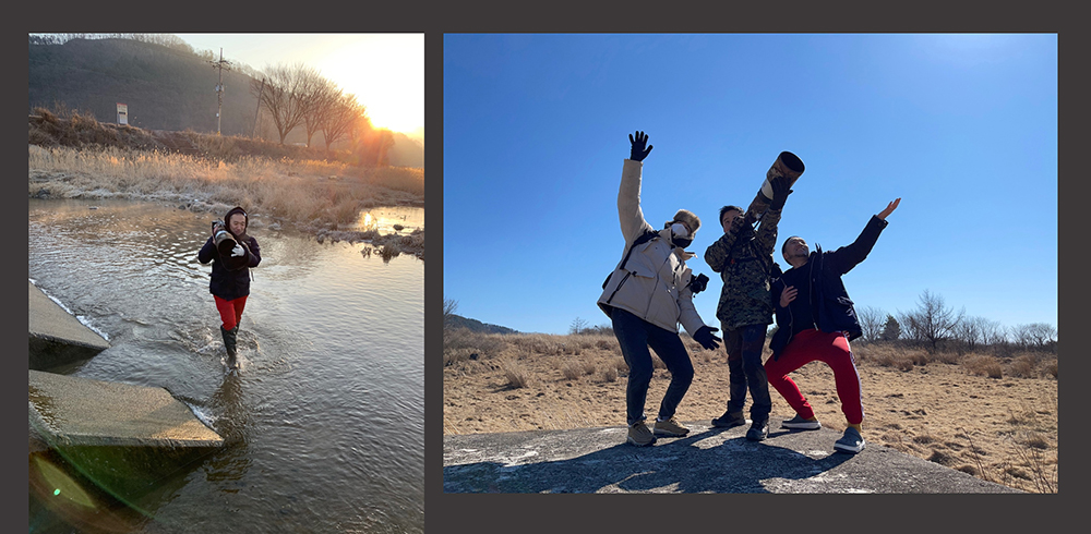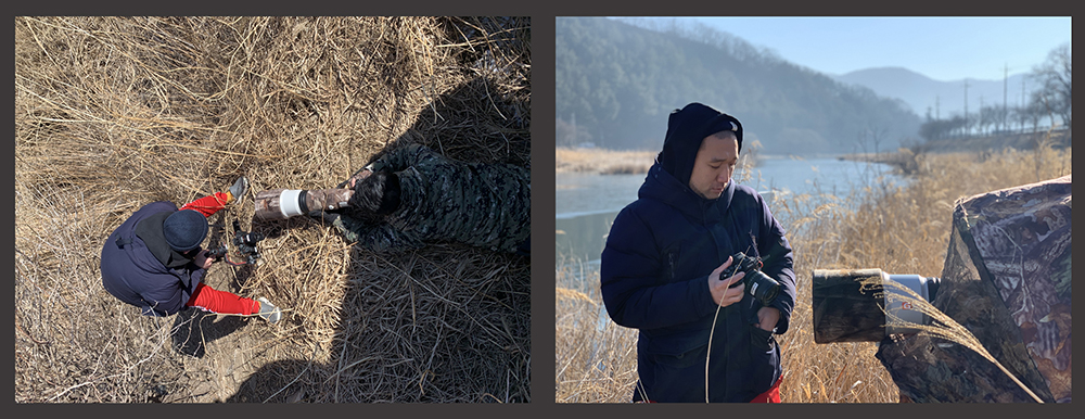 뛰고, 갈대와 나뭇가지를 헤치고, 비탈진 산을 오르고, 엎드리고, 쪼그리는 등 실제 조류 촬영 때의 모습을 그대로 재현하며, 힘들지만 웃으며 즐겁게 촬영했던 현장 모습이 아직도 생생하네요.