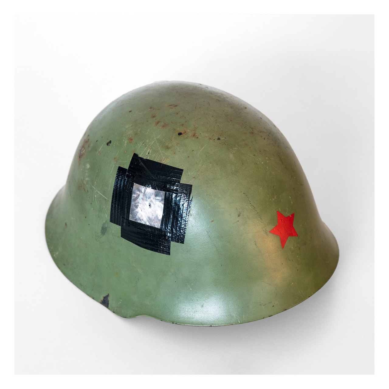 첫 번째 사진은 옛 유고슬라비아의 휘장이 새겨진 군용 헬멧을 개조해서 만든 핀홀 카메라의 모습을 담은 사진이고, 두 번째 사진은 첫 번째 작품의 헬멧 핀홀 카메라를 통해 촬영한 모습을 담은 사진입니다. 이 헬멧 핀홀 카메라가 비춰주는 모습이 마치 이 헬멧을 쓰고 있던 군인의 시점을 다시 재반영해주는 것 같습니다.