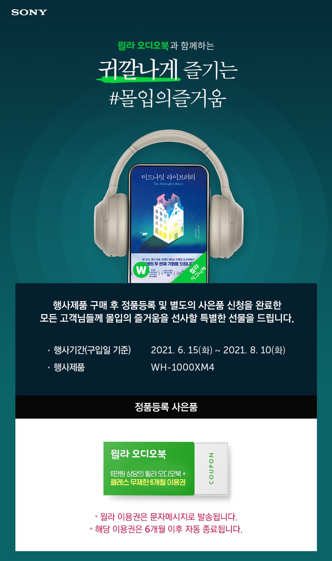 프로모션 행사 기간 내에 소니 무선 노이즈 캔슬링 헤드폰 WH-1000XM4 구매 후, 8월 17일까지 소니코리아 고객지원 사이트(www.sony.co.kr/electronics/support)에서 정품등록 및 사은품 신청을 완료하면, 최신 베스트셀러 오디오북과 각 분야별 최고 강사의 클래스까지 즐길 수 있는 ‘윌라 오디오북+클래스 무제한 6개월 이용권’을 받아보실 수 있습니다.