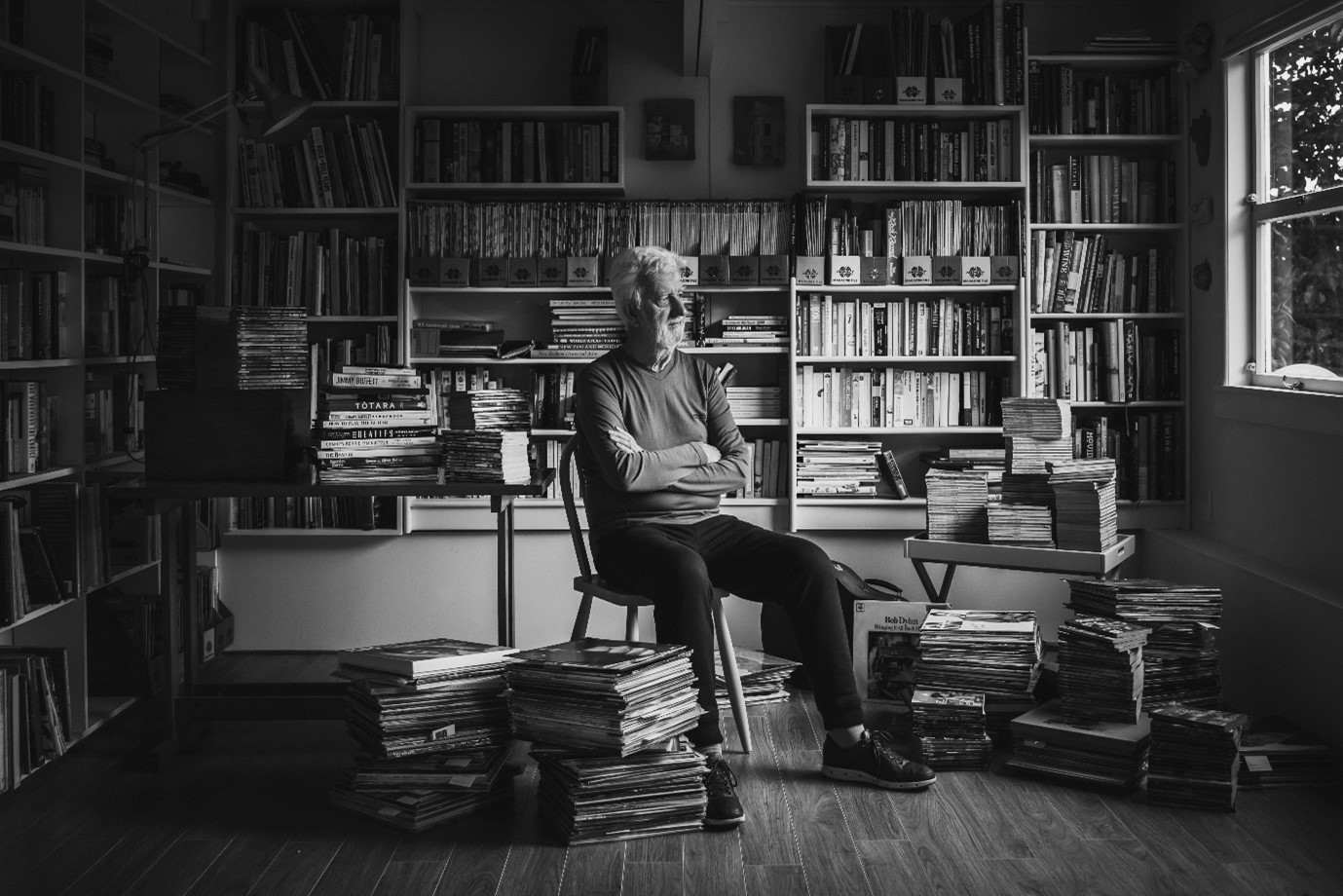 한 남성이 주변에 책과 잡지를 쌓아둔 채 앉아 있는 이 사진은 뉴질랜드의 ‘Aimee Glucina’ 작가의 ‘A Life's Work’ 라는 사진입니다.