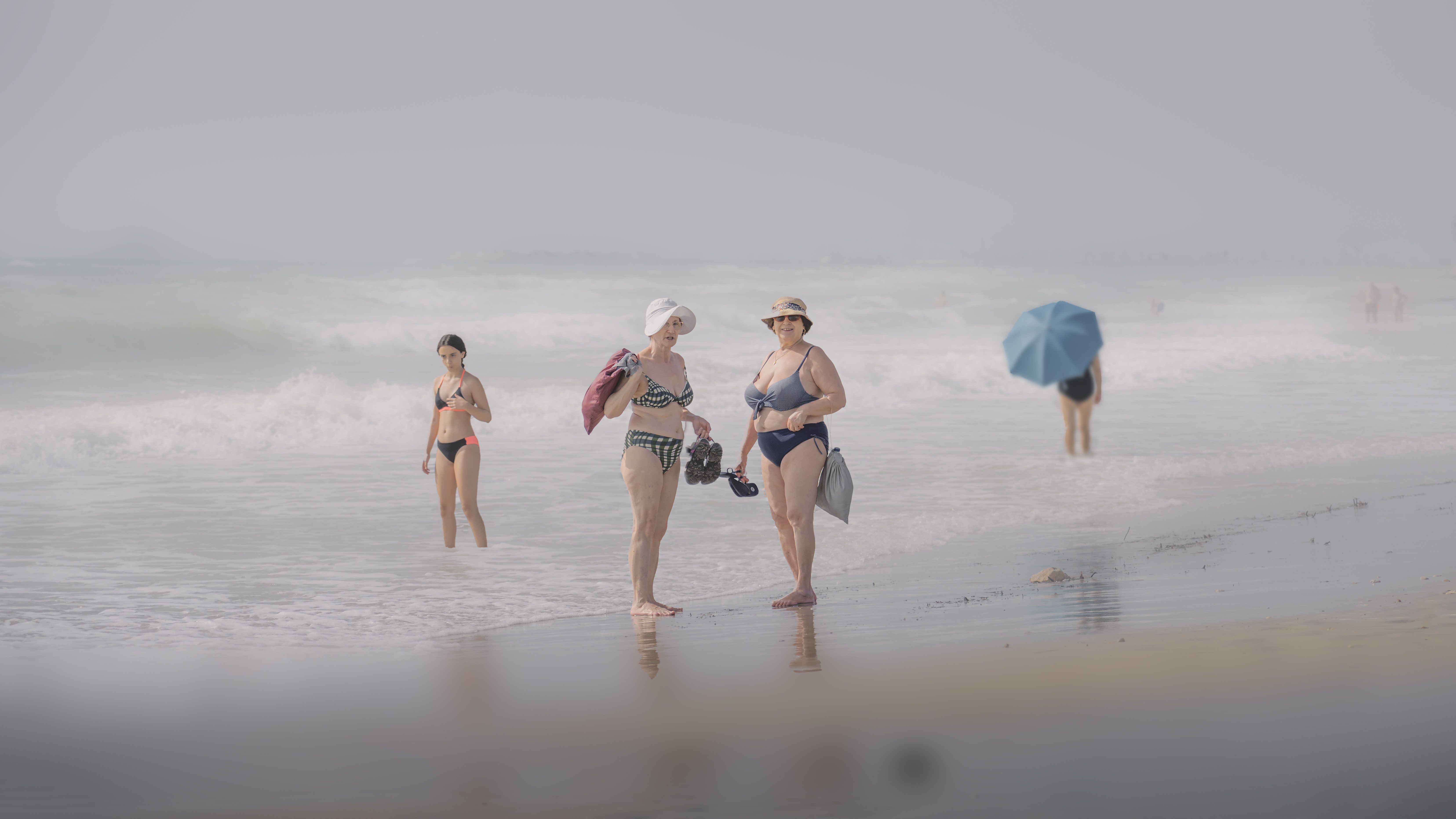 여름의 지중해 바다를 떠올리면 투명하고 맑은 바다와 푸른 하늘을 떠올리기 마련인데, 사진 속 날씨는 금방이라도 비가 올 듯 주변이 회색 빛으로 물든 것처럼 보입니다. 반면에 사람들은 밝은 빛을 받은 것처럼 선명하고 밝게 표현되었으며, 이 상황을 즐기는 것처럼 보이기도 하죠.