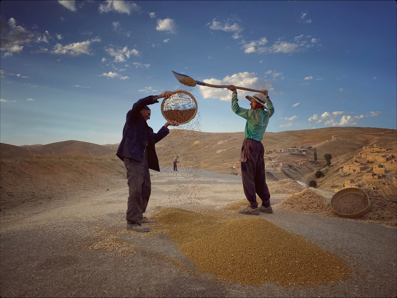 쌀쌀한 가을 수확한 농작물을 체에 거르고 있는 두 남성을 담은 이 사진은 ‘Hamed Rahmati’ 작가의 ‘Farmers Clearing Chickpeas’ 사진입니다.