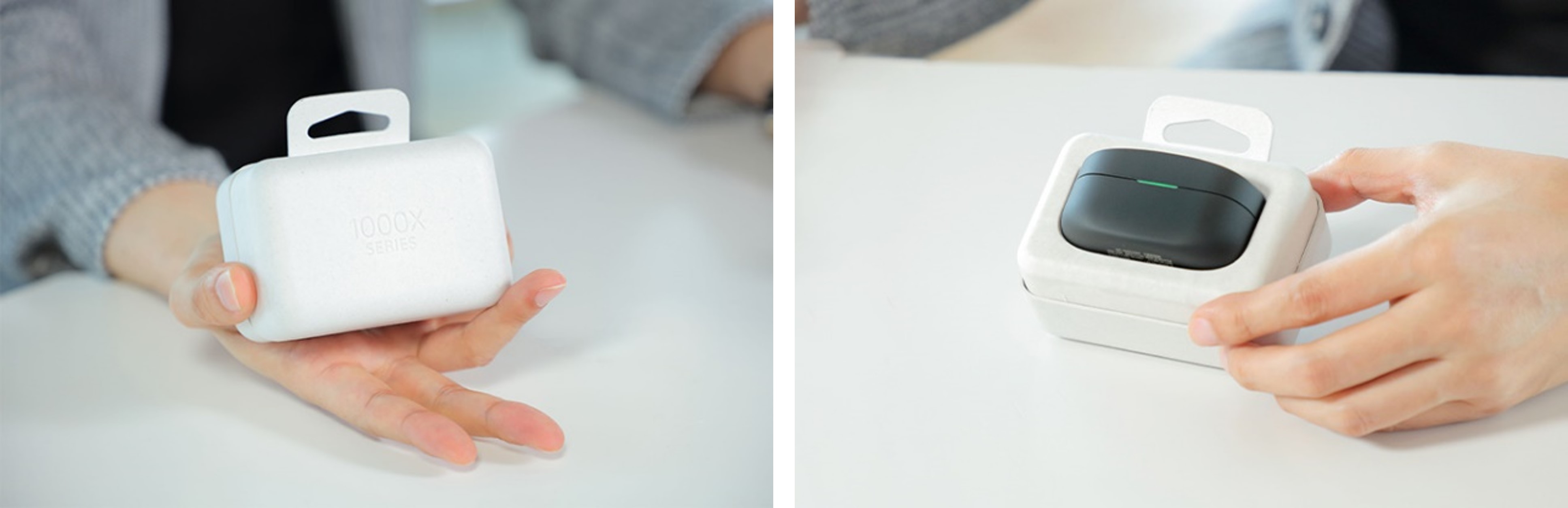 오니시 [디자인 담당]: 네. WF-1000XM4는 플라스틱이 없는 패키지를 사용하고 있습니다. 제품 개발 초기, 사용자를 대상으로 디자인 설문 조사를 진행했는데요. 그 결과, 많은 사람들이 환경 문제를 인식하고 있으며, 기업과 개발자가 적절한 조치를 취해줄 것을 원하고 있었죠. 그래서 WF-1000XM4에 적용하기 위해 소니의 오리지널 블렌드 재료(Original Blended Material)를 사용하여 새로운 친환경 패키지를 개발했습니다. 포장뿐만 아니라 스크래치로부터 제품을 보호하는 보호 시트도 사용하지 않아 플라스틱이 하나도 사용되지 않았죠.