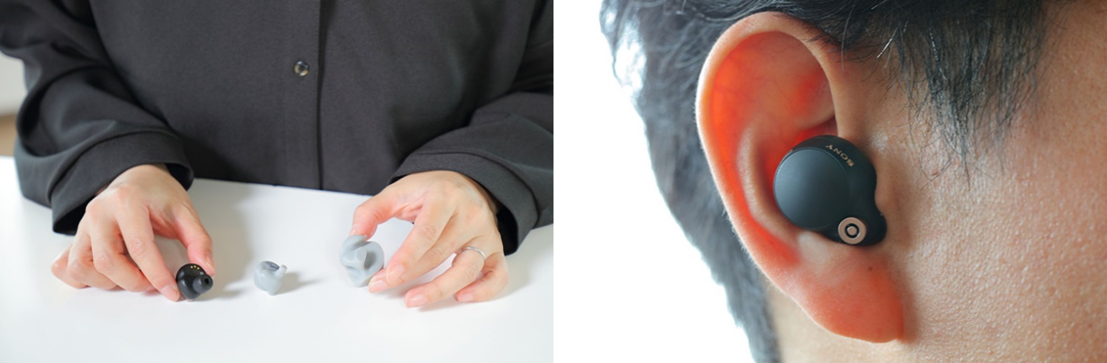오니시 [디자인 담당]: WF-1000XM3는 이어폰을 귀의 3개 지점에 고정하는 인체공학적인 ‘Tri-Hold 구조’ 라고 불리는 방식을 사용했지만, WF-1000XM4는 착용감 개선을 위해 점이 아닌 표면으로 지지할 수 있는 새로운 구조를 선택했습니다. 개발 초기 단계에서는 귀 안 쪽에 액체를 넣어 굳힌 것 같은 귀 안쪽의 모양을 그대로 본뜬 모형을 만들었고, 기기 디자인 팀과 함께 어떻게 이를 이어폰에 구현할 수 있을지 고민했습니다.