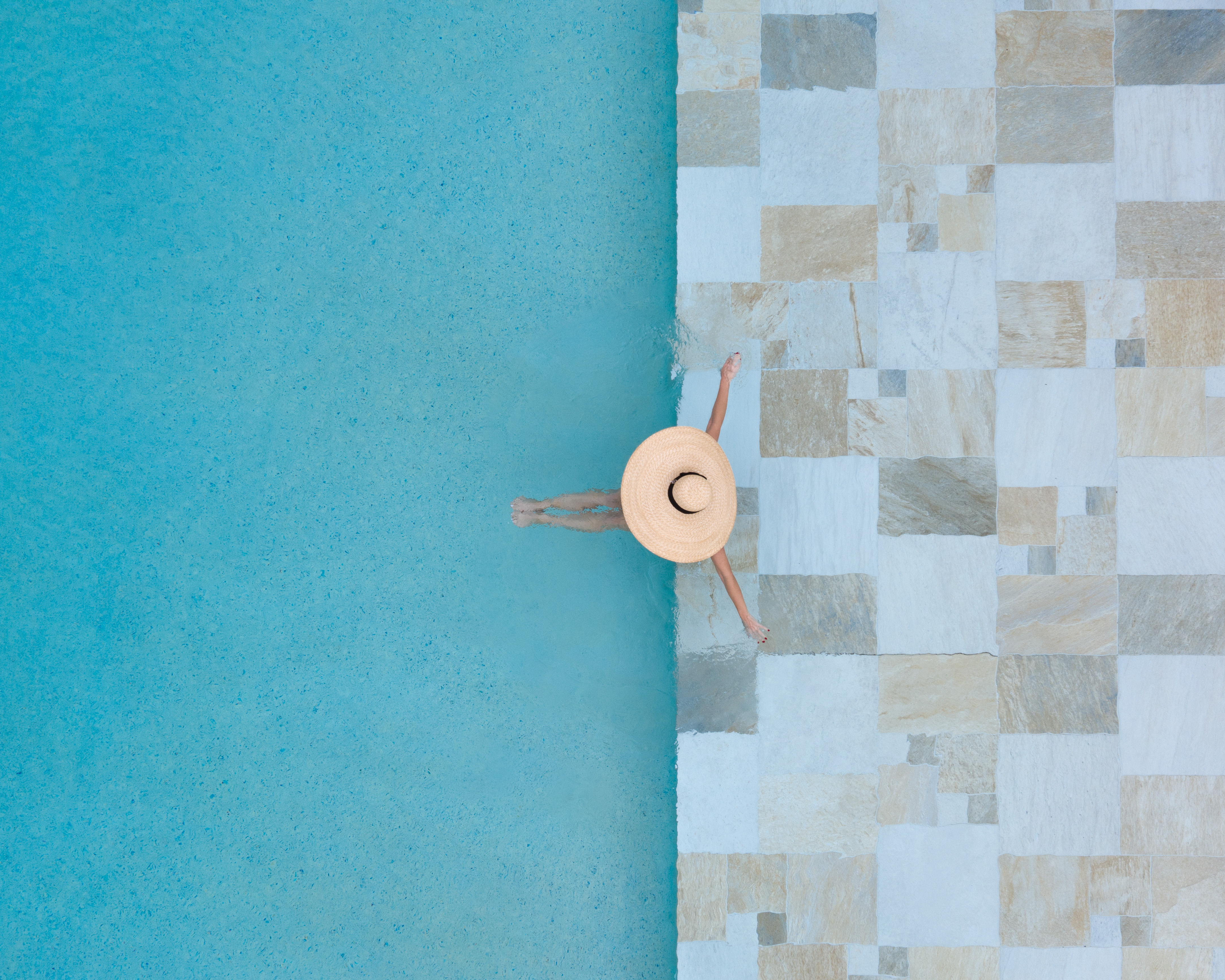수영장에 발을 담그고 여유를 즐기고 있는 사진 속 주인공을 보니 당장이라도 시원한 수영장으로 몸을 던져 더위를 식히고 싶다는 생각이 절로 드는데요. 휴양지에 놀러간 듯한 느낌이 물씬 나는 챙이 넓은 모자를 쓰고, 수영장에서 홀로 자유롭게 물놀이를 즐기는 모습에 여름 휴가에서의 여유로움이 느껴져 마음이 한결 편안해지는 것 같습니다.