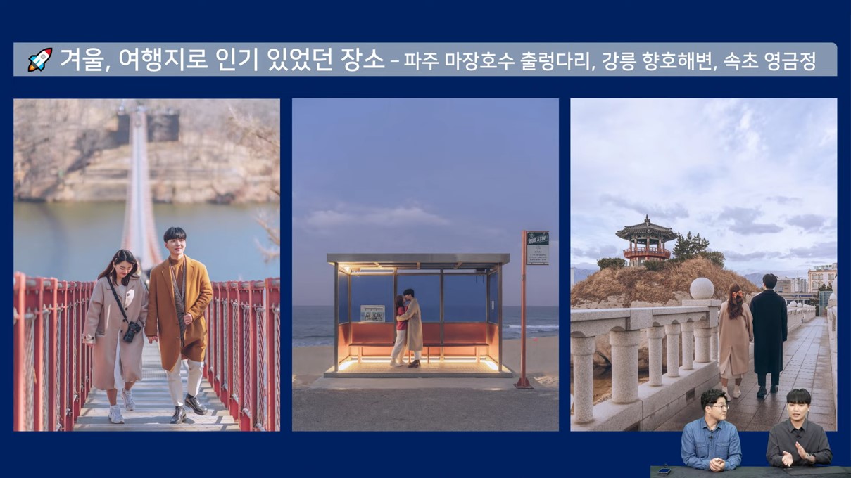 사실 겨울에 인생 사진을 촬영하기란 쉽지 않죠. 이럴 땐, 사람이 많아 사진찍기 곤란했던 인기 여행지를 방문해보는 것은 어떨까요? 이 세상에 우리 둘만 남은 듯한 특별한 순간을 기록할 수 있을 것입니다. 이번 겨울에는 파주 마장호수 출렁다리, 강릉 향호해변, 속초 영금정에서 커플 인생 사진을 한번 남겨보세요.