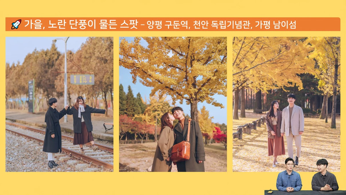 가을하면 노랗게 물드는 은행나무가 생각나죠. 첫사랑의 설렘을 떠올리게 하는 건축학개론의 촬영지인 양평 구둔역에서 사랑하는 인연과 함께하는 두근거림을 느껴보는 것은 어떨까요? 이 외에 천안 독립기념관, 가평 남이섬도 추천하는 가을 촬영 스팟 중 하나입니다.