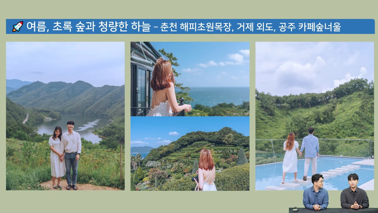 햇살을 받고 자란 초록 숲과 청명한 하늘을 자랑하는 여름은 바라보기만 해도 속이 뻥 뚫리죠. 좀 더 특별한 장소에서 커플 인생 사진을 찍을 수 있는 스팟을 소개하려고 하는데요. 소양강을 감싸는 초록 숲과 하늘을 내려다볼 수 있는 춘천 해피초원 목장, 숲 너머 푸른 바다와 하늘이 조화를 이루는 거제 외도 보타니아, 마지막으로 돌다리가 인상적인 공주 카페숲너울이 있습니다.