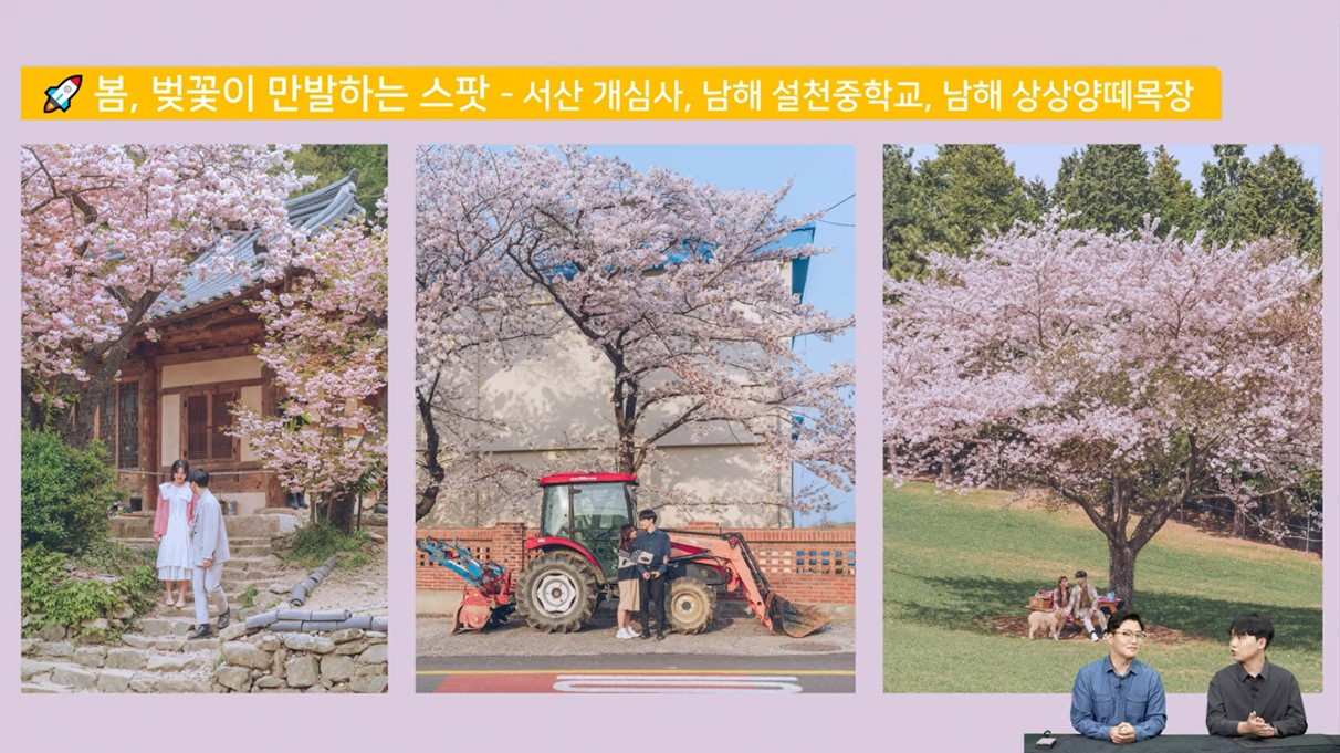 벚꽃이 흩날리는 봄에 아름다운 커플 사진을 담을 수 있는 촬영 스팟을 소개해 드릴게요. 서산 개심사에서는 국내에서 유일하게 청벚꽃을 볼 수 있고, 남해 설천중학교는 벚꽃 아래에서 낭만적인 사진을 촬영할 수 있답니다. 동화 속 주인공이 된 듯한 분위기를 연출할 수 있는 남해의 상상양떼목장도 추천드려요.