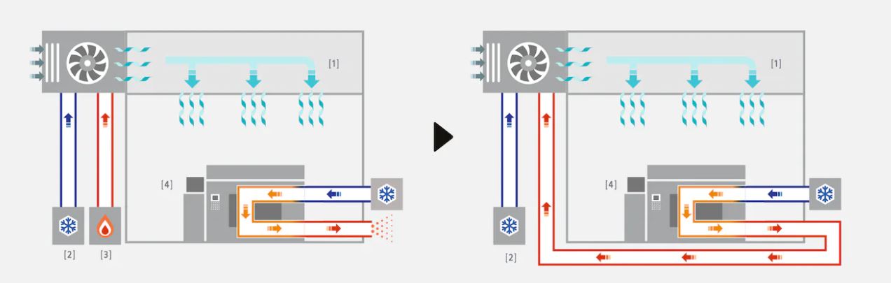 이미지센서와 같은 오늘날의 최신 반도체는 청정실 없이는 제조될 수 없으며, 특정 범위의 온도, 습도 및 청정도를 유지하기 위해 많은 에너지가 필요한데요. 청정실 공기의 정확한 온도 제어를 위해서는 보일러에서 공급되는 공기와 냉각 공기를 혼합합니다. 청정실 외부의 냉각 공기로 기계를 냉각하며 실내 온도를 일정하게 유지하는 것이죠.